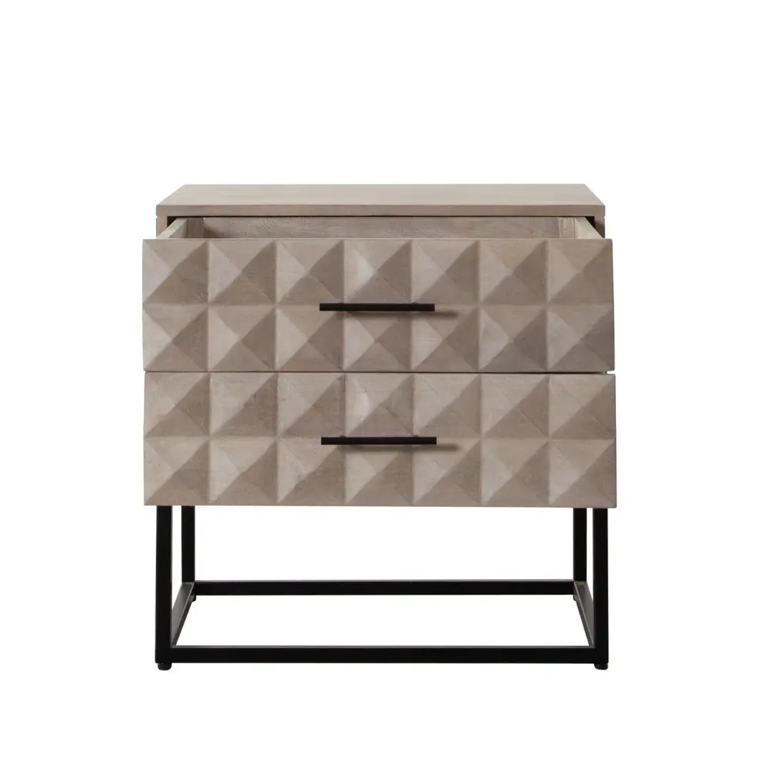 Upgrade your bedroom with the Madera 2-Drawer Solid Wood Nightstand, a perfect blend of modern design and rustic charm. Crafted from premium solid wood, this nightstand features a soft Ash finish that enhances the natural beauty of the wood grain, bringing warmth and sophistication to your space. The black powder-coated metal legs provide a contemporary contrast while ensuring sturdy support for years of use.