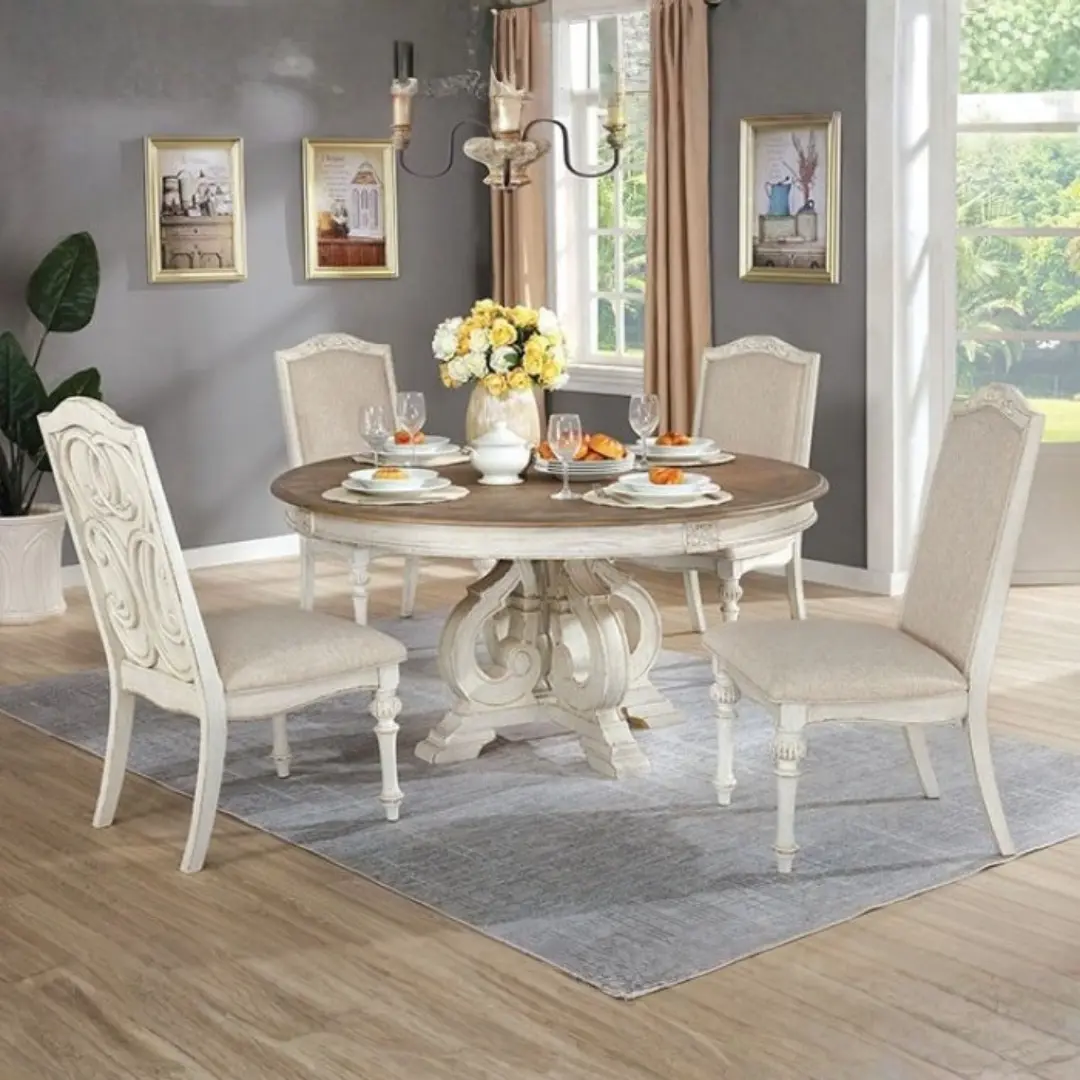 At the heart of the Arcadia collection is a beautifully crafted round dining table featuring rich wood veneer inlays and ornate carved accents. The antique white finish, complemented by a subtly distressed look, adds just the right amount of texture — ideal for those curating a warm and inviting cottage, farmhouse, or transitional interior.