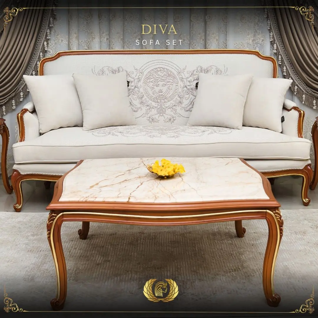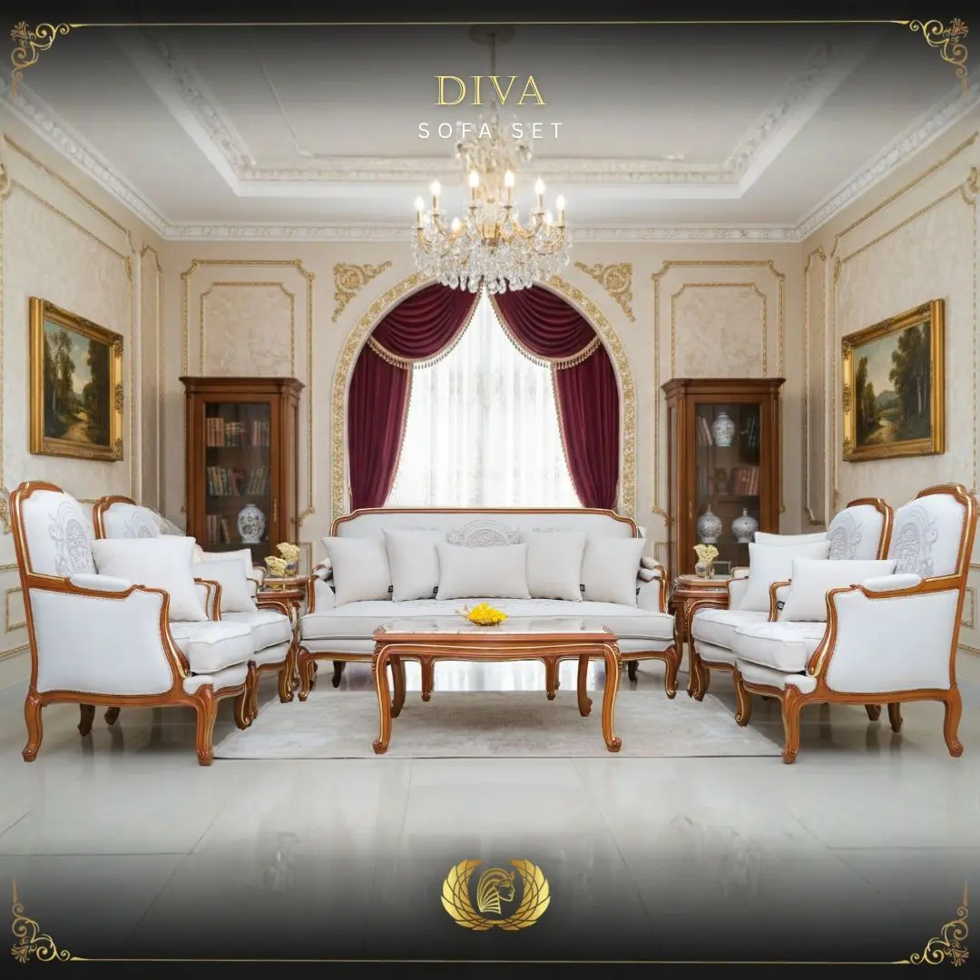 The Diva Sofa Set by Kleopatra Kingdom is a celebration of classic grandeur and refined craftsmanship. Draped in luxurious off-white Diva fabric and framed in a rich brown finish with radiant gold accents, this masterpiece embodies sophistication with an unmistakable aristocratic presence. Designed to elevate distinguished interiors, it blends comfort, artistry, and heritage in perfect harmony.