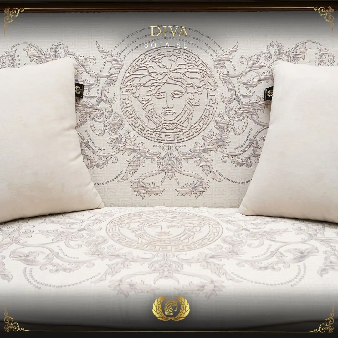 - Premium Versace-patterned fabric in an elegant off-white tone