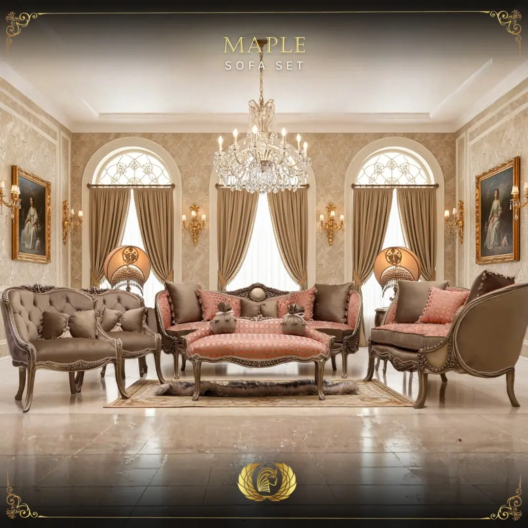 The Maple Sofa Set by Kleopatra Kingdom celebrates Neoclassical sophistication with modern warmth. Handcrafted from premium beech wood and finished in elegant champagne, each piece radiates timeless refinement. Upholstered in a luxurious pumpkin and taupe fabric blend, it balances color, comfort, and craftsmanship — creating an inviting atmosphere of quiet grandeur.