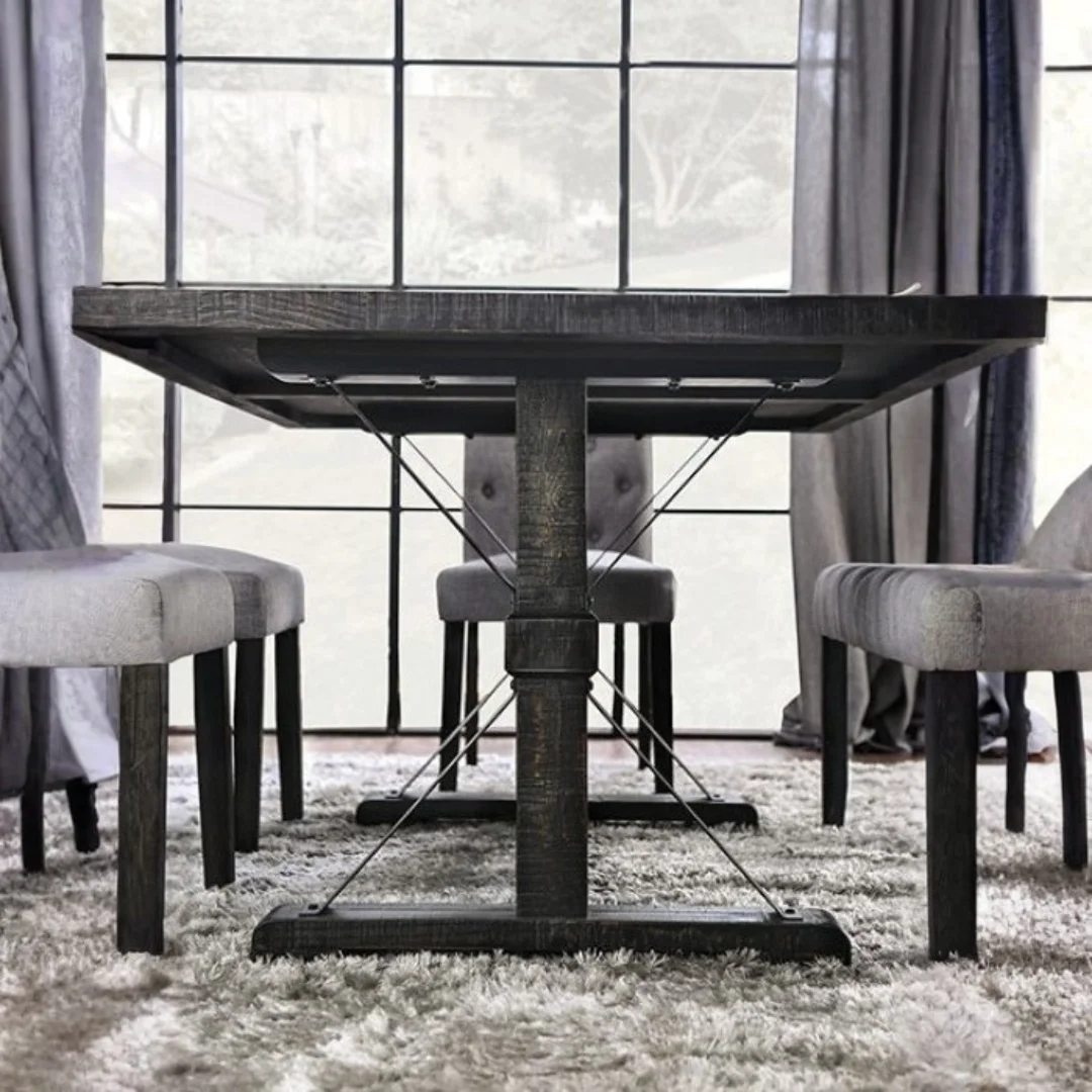 Enhance your dining experience with the Alfred 6 Pc Dining Table Set w/ Bench Rustic by Furniture of America — a masterfully crafted centerpiece designed to bring warmth, elegance, and functionality to your home. Featuring a beautifully weathered black table top, a sturdy trestle-style foundation with industrial metal accents, and matching seating that blends comfort with classic charm, this set is tailored for those who appreciate quality construction and rustic sophistication.