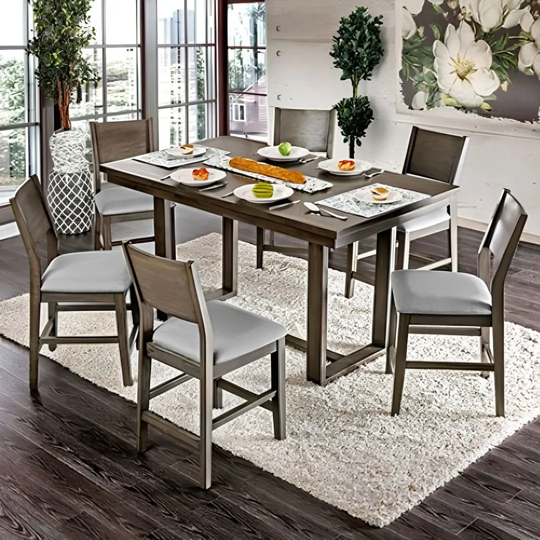 The centerpiece of this set is a sleek gray-finished counter-height table, crafted to bring a contemporary edge to any dining room, entertaining nook, or open-plan kitchen. Accompanying the table are six stylish chairs, each cushioned and upholstered in a soft light gray fabric that balances the set’s bold profile.