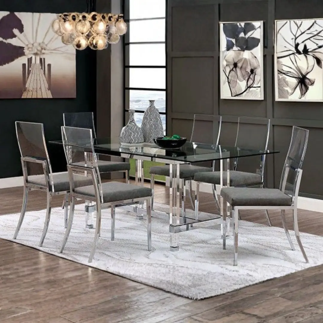 Elevate your dining space with the sleek sophistication of the Casper 7 Pc Dining Table Set Contemporary by Furniture of America. Designed to blend artistic form with durable function, this luxurious dining set transforms everyday meals into exceptional moments. With chrome-finished accents, premium materials, and a striking glass tabletop, Casper is the discerning choice for lovers of high-end, modern interiors.