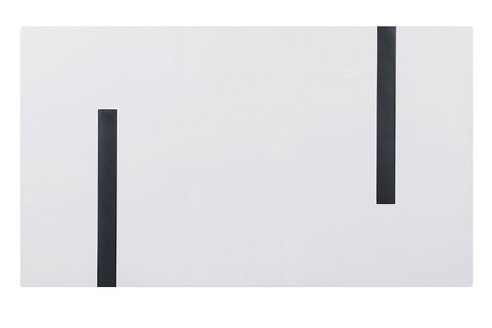 The high-gloss white tabletop is accented by black metal lines that extend seamlessly through the surface, creating a dramatic geometric effect. This unique design adds depth and visual movement, turning the table into a functional piece of modern art.
