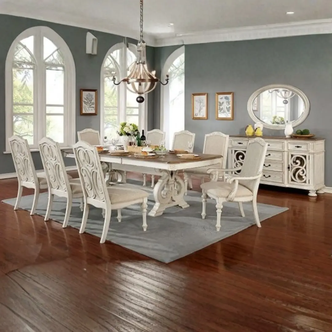At the center of this set is a stately dining table featuring exquisite carved details, intricate wood inlays, and a rich two-tone antique white and natural wood finish. These traditional elements bring visual depth and a dramatic presence to your dining area while maintaining a warm, welcoming atmosphere.