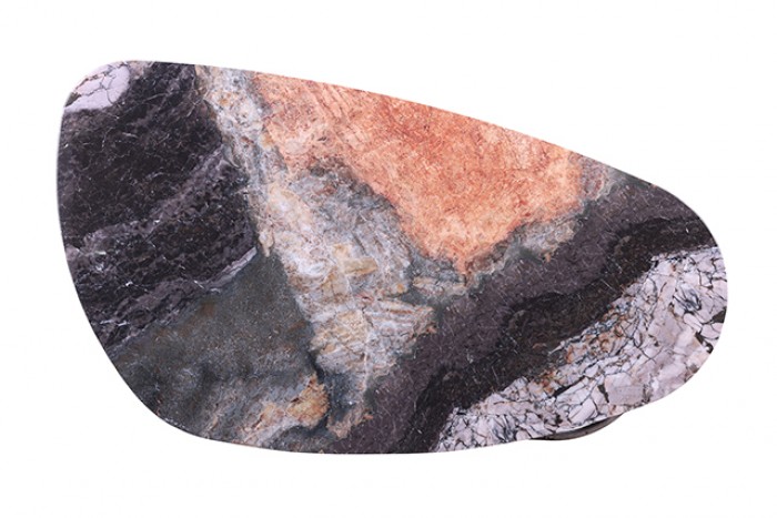 Design Highlights: Soft curved-edge tabletop, sintered stone surface, cylindrical 3-leg base