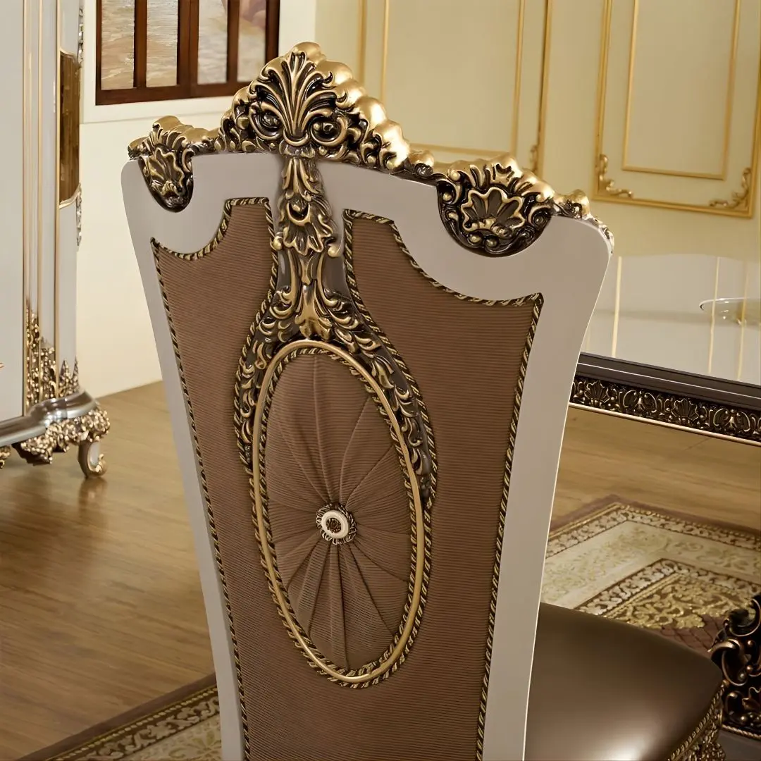Each element in the HD-1881 dining set serves a purpose in both form and function. The impressive dining table is crafted from a composite core and finished in a high-gloss lacquer — ensuring structural integrity without sacrificing aesthetic appeal. Whether you’re hosting a formal gathering or enjoying an intimate dinner, its spacious design and regal finish make every moment memorable.