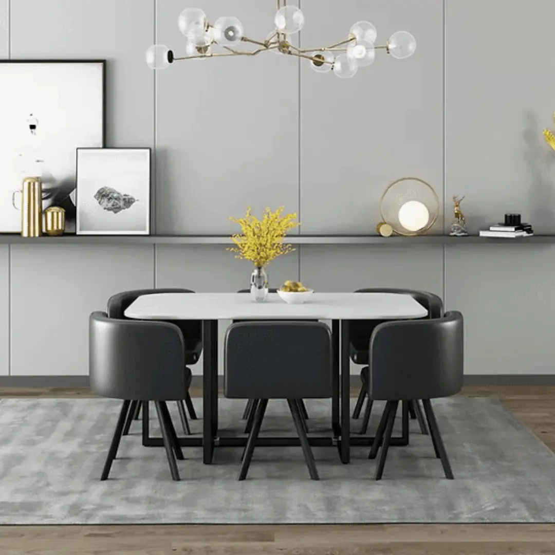 Elevate your dining experience with the 800 White Marble Dining Table Set for 6 by Artisan Furniture — a masterpiece of contemporary style and functional design. This sophisticated set blends the timeless aesthetic of marble with the resilience of high-quality materials, making it the ideal centerpiece for modern homes and professional interiors alike.