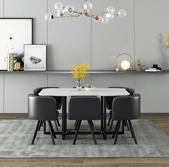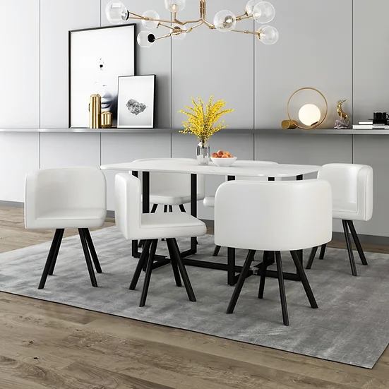 Transform your dining space with this stylish and modern white marble dining table set for 6. Featuring a printed white marble top crafted from high-quality MDF, this table brings the luxurious look of marble without compromising durability. The sturdy black metal base provides a sleek contrast, adding a contemporary edge to the design. Paired with six elegant chairs upholstered in a blend of green and white fabric, this set delivers both comfort and sophistication. Perfect for family meals or hosting guests, this artisan-crafted ensemble is designed to create a warm and inviting dining experience.