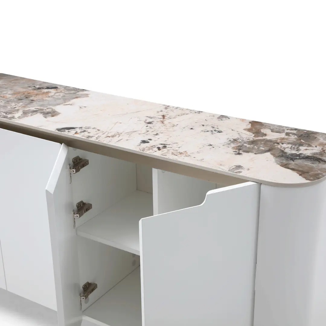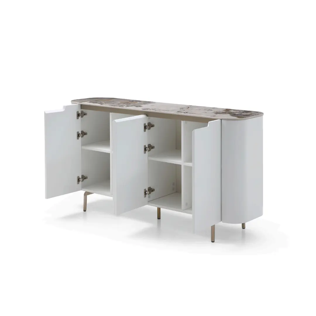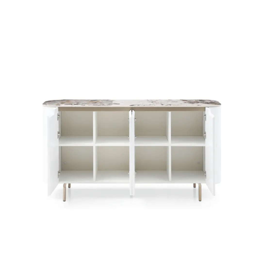 The 4-Door Buffet with a Gloss Luxury Pandora top and Golden Champagne finish is a stunning and opulent piece of furniture that combines functionality with exquisite design. This buffet is designed to elevate the style and functionality of any dining or living space.