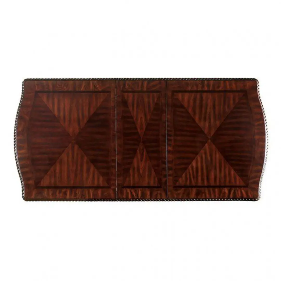 The Bellagio dining table commands attention with its intricately crafted double pedestal base and rope-carved edges — traditional hallmarks of Italian-inspired elegance. Constructed from durable solid wood and rich wood veneers, this heavyweight table promises years of daily use and timeless style. With two 18-inch extension leaves, it comfortably expands to host large gatherings while maintaining a balanced, symmetrical profile.