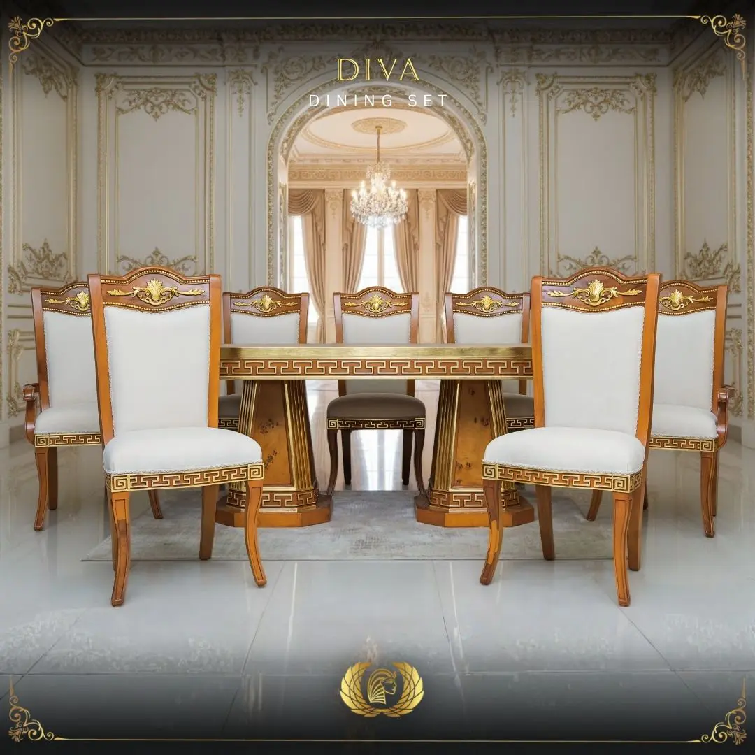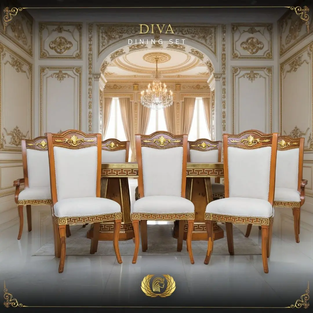 The Diva Dining Set by Kleopatra Kingdom is a masterpiece of classical refinement, designed to transform every dining experience into a statement of prestige. Upholstered in luxurious off-white fabric and framed in a rich brown finish adorned with radiant gold accents, this ensemble exudes warmth, heritage, and unmistakable sophistication. Every detail reflects artistry, balance, and timeless European grandeur.