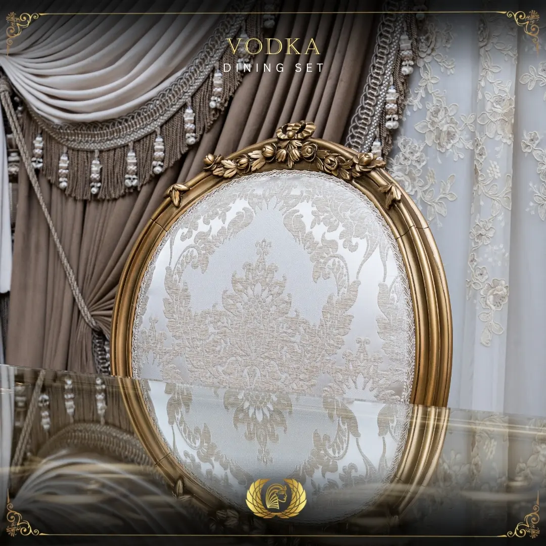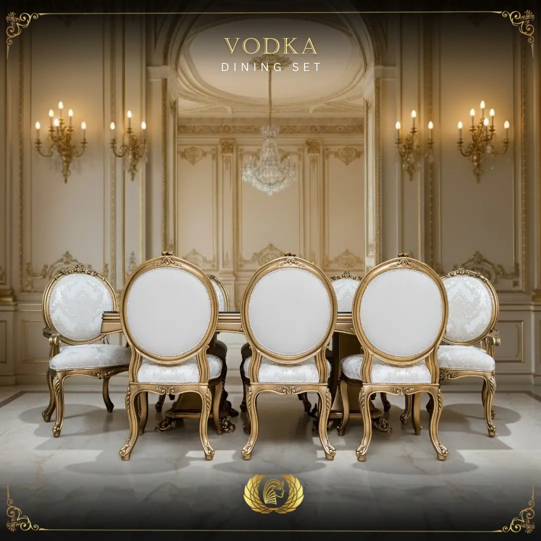 The VODKA Dining Room Collection by Kleopatra Kingdom captures the grandeur of Rococo dining artistry. With its gilded frame, ornate carvings, and off-white upholstered chairs, this dining set becomes the heart of gatherings, where elegance and comfort blend seamlessly.