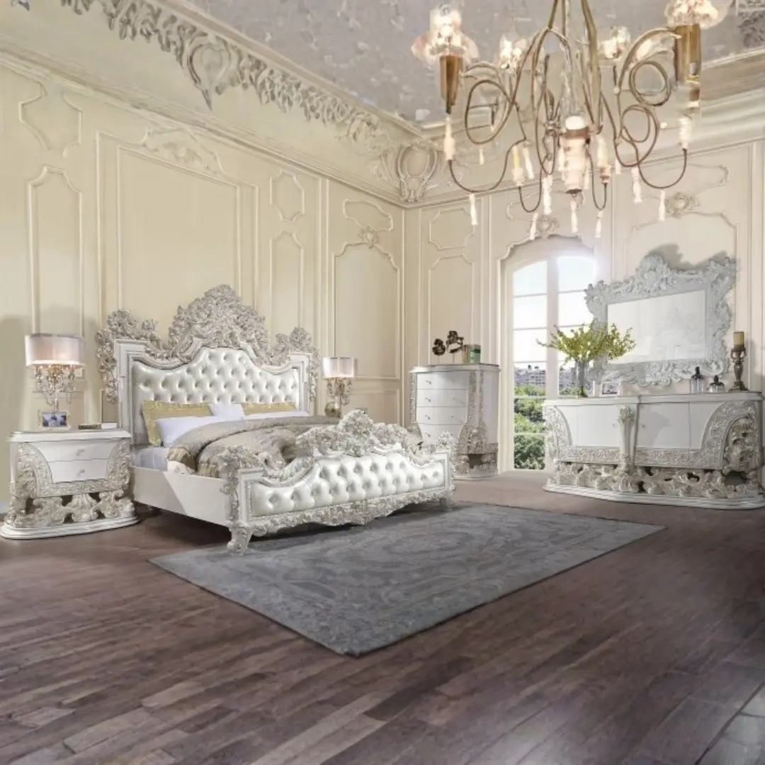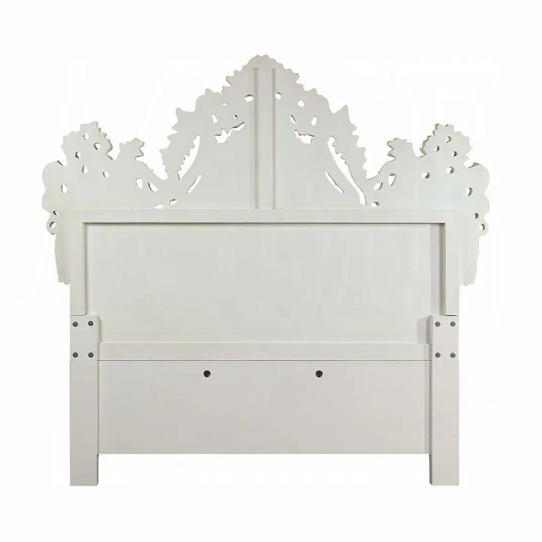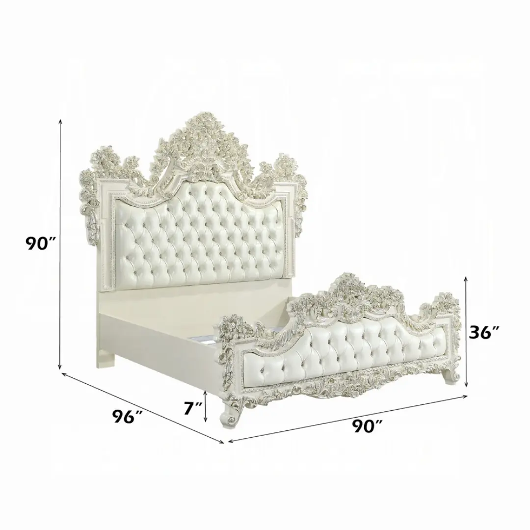 Elevate your master bedroom with the Adara White Leather Eastern King Bed by ACME, where classic Rococo-inspired design meets modern comfort. This show-stopping centerpiece transforms any space with its sophisticated profile, exquisite craftsmanship, and luxurious finishes. The antique white frame, adorned with hand-brushed light gold accents, amplifies the elegance of its intricately carved floral motifs — all elevated by a pearl white synthetic leather upholstery with sparkling acrylic diamond tufting.