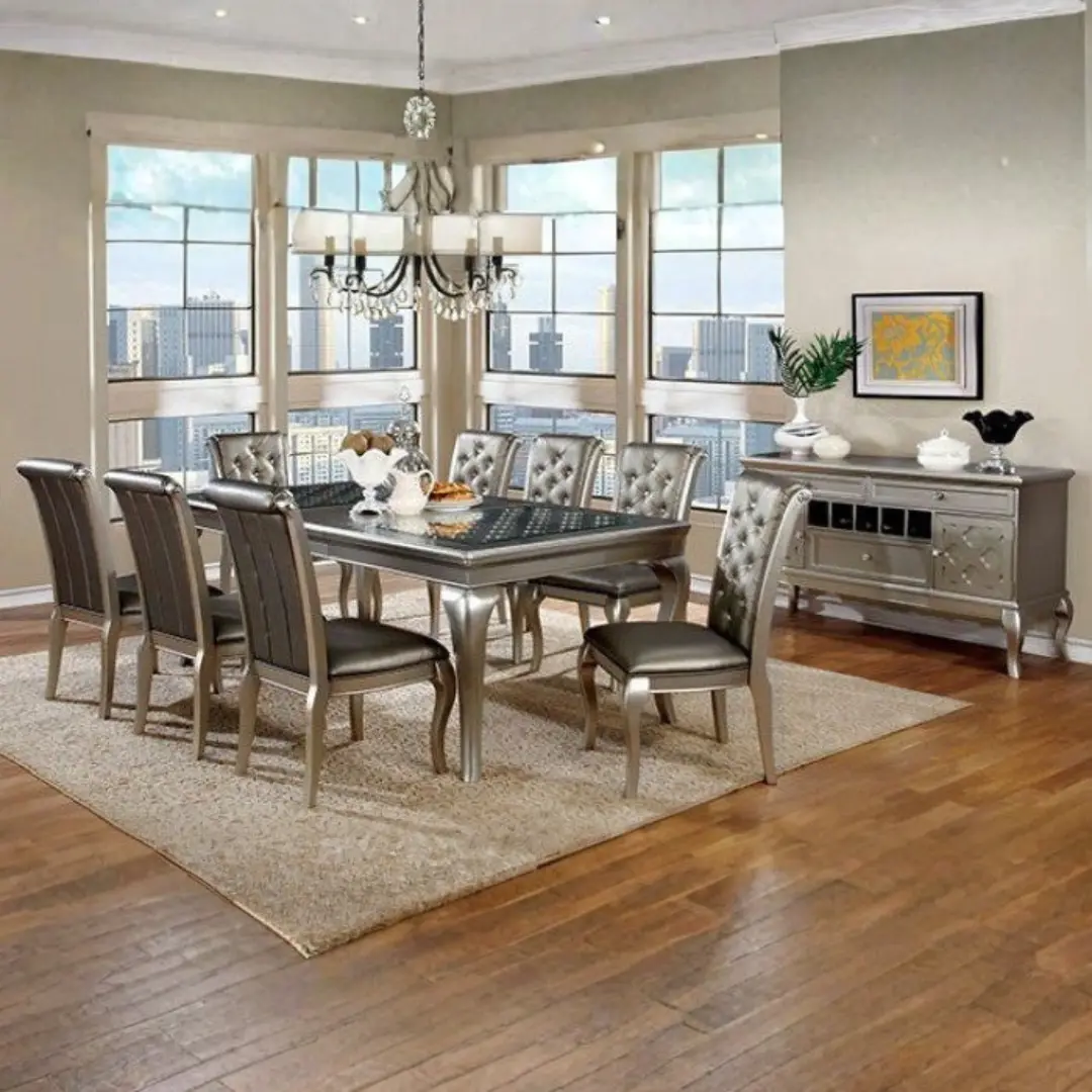 Make a sophisticated statement in your dining room with the Amina 66″ Dining Table CM3219T-66 by Furniture of America—a luxurious fusion of transitional elegance and contemporary sparkle. Designed to captivate, this 66-inch centerpiece is finished in a radiant champagne hue, delivering a refined aesthetic ideal for upscale interiors. Whether you’re entertaining guests or enjoying everyday meals, this dining table adds a glamorous focal point that never sacrifices functionality or quality.
