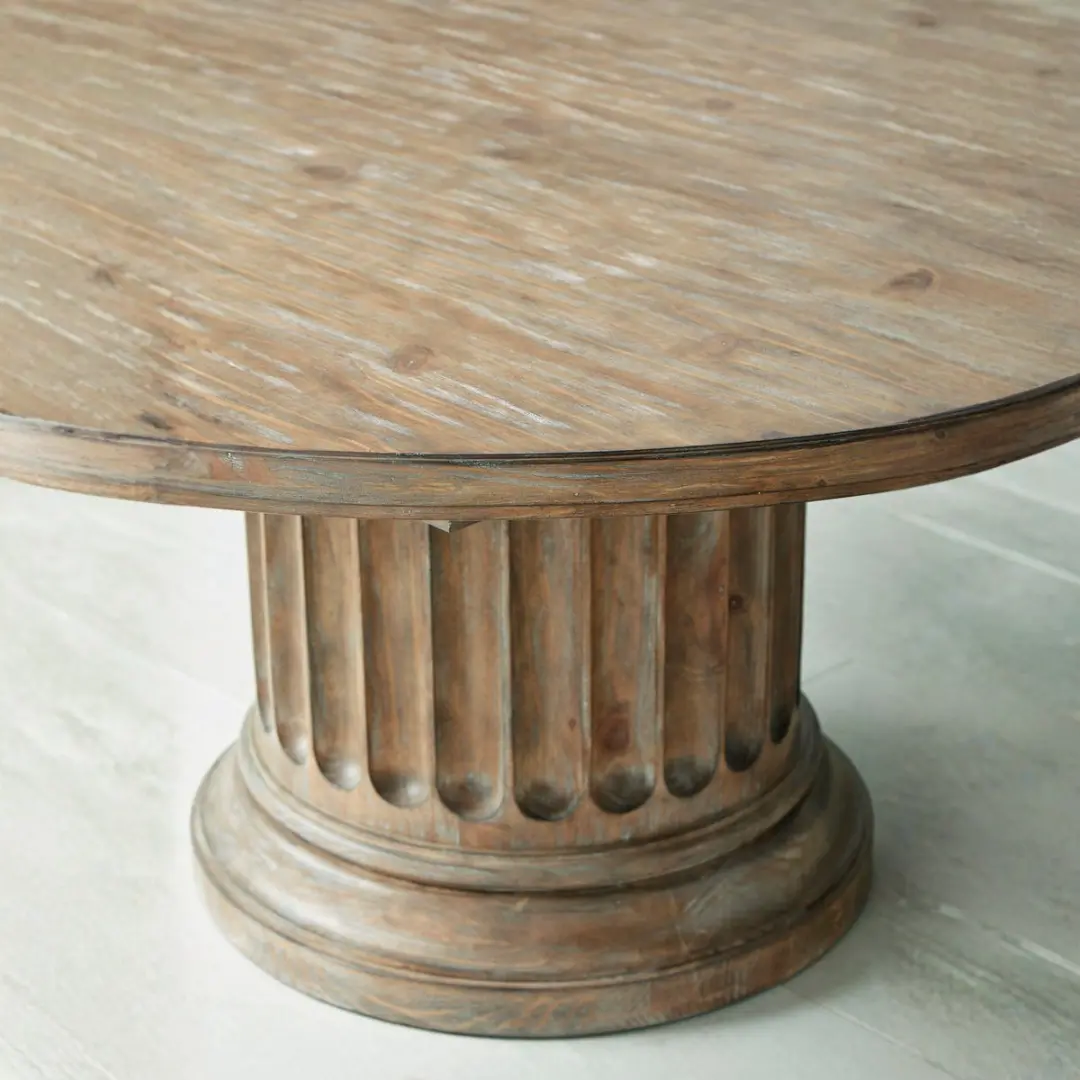 Crafted from high-quality rustic pine and finished in a hand-glazed warm almond tone, the tabletop beautifully highlights the natural wood grain, adding depth and texture to your space. At its core, a bold fluted column base evokes classical Roman columns—an emblem of strength and timeless beauty—while offering solid stability for everyday use and special occasions alike.