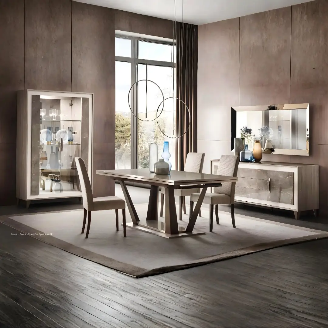 This exquisite set effortlessly merges traditional aesthetics with contemporary flair, thanks to its high gloss lacquer finish and precisely curated matte details. Every element, from the sculptural lines to the intricate detailing, is crafted with enduring materials to ensure long-term durability. Whether hosting formal dinners or showcasing your refined taste in decor, ArredoAmbra transforms your dining room into a unique experience of prestige and style.