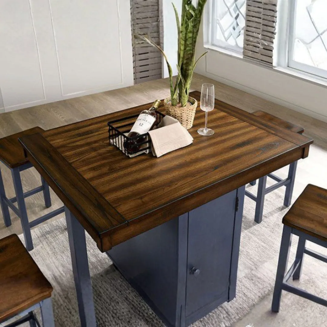 The Azurine set brings timeless transitional styling into your dining area with a striking two-tone finish—slate blue base and antique dark oak top—that instantly offers a relaxed, beach-inspired ambiance. The counter-height tabletop boasts natural woodgrain textures, perfect for adding warmth and organic character to modern kitchens or cozy apartments.