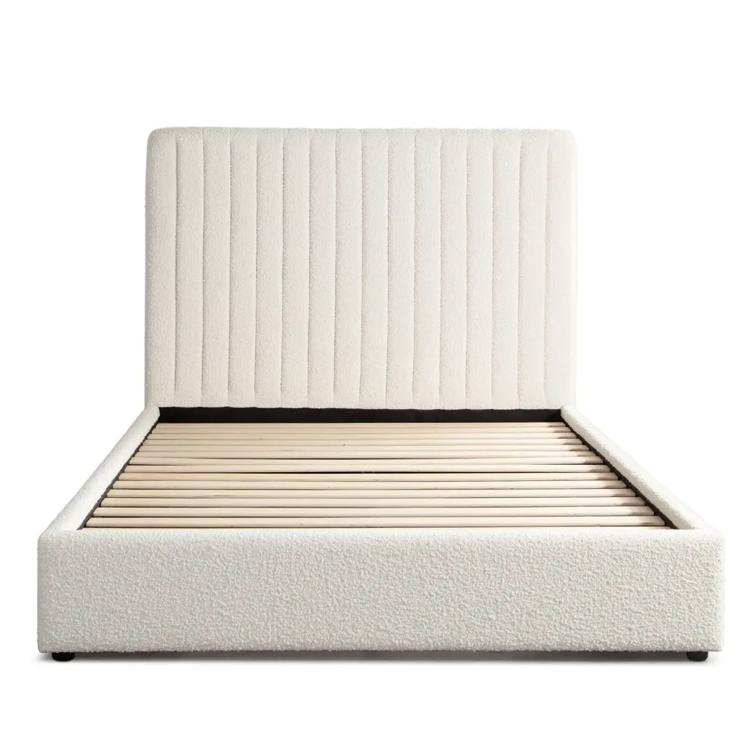 Ivory Boucle Upholstery: Soft, inviting fabric with a warm neutral tone that complements any bedroom palette.