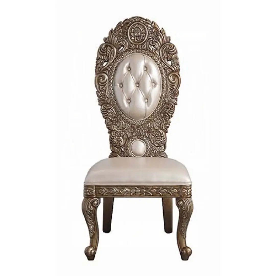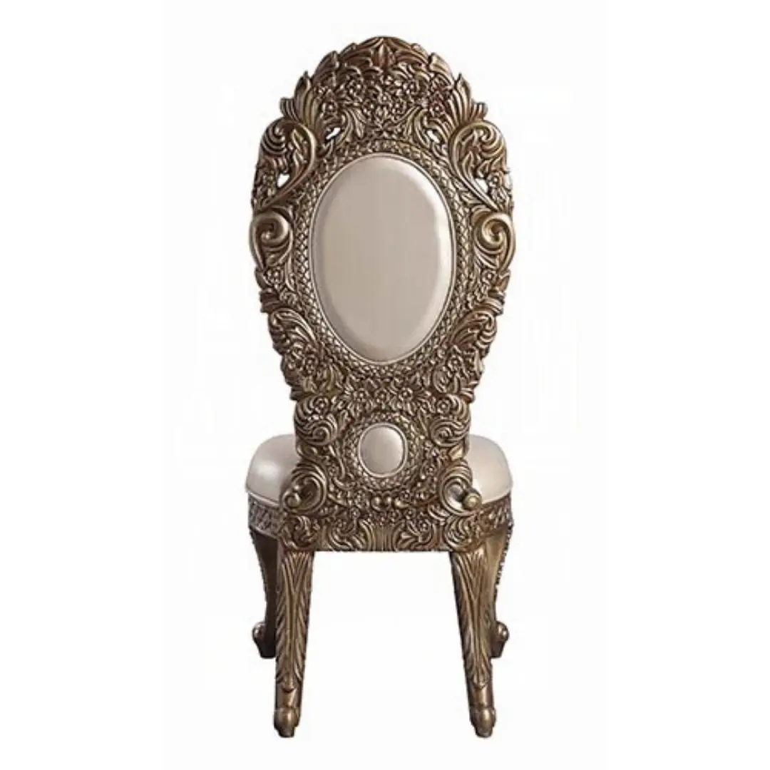 The leather side chair showcases intricate scrollwork inspired by classical European Baroque furniture design. Every detail is crafted to create a luxurious visual statement that enhances any dining room with a sense of royalty and grandeur.