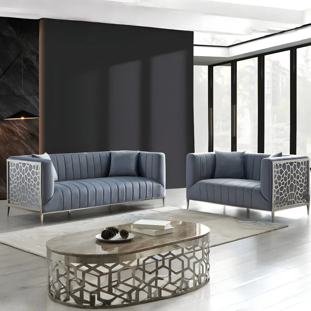 The combination of velvet and metallic finishes reflects today’s most sought-after interior trends, creating a statement piece that elevates your living room instantly.