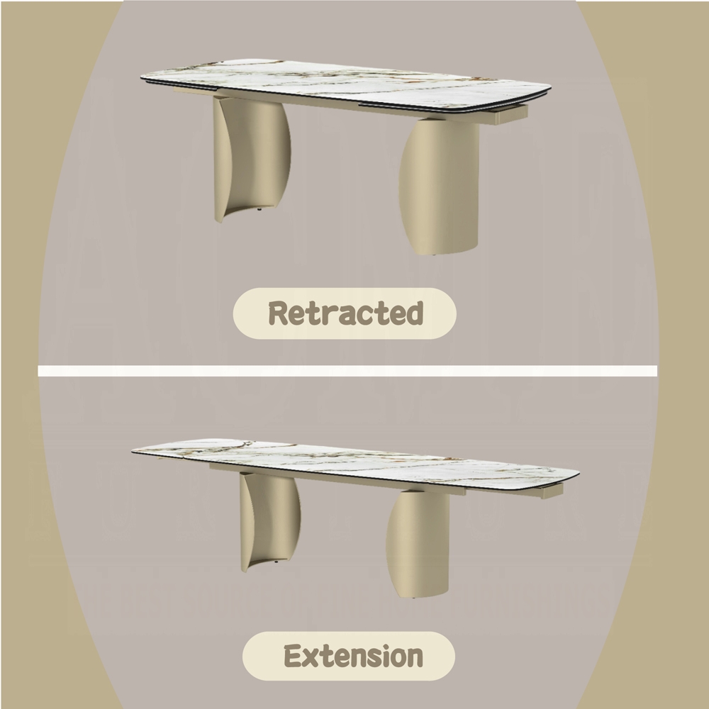 The table’s ceramic top mimics the upscale look of marble while offering superior durability and resistance to scratches, heat, and moisture. Its brilliant white surface is complemented by a lustrous golden champagne pedestal base, creating a harmonious fusion of glamour and contemporary structure.