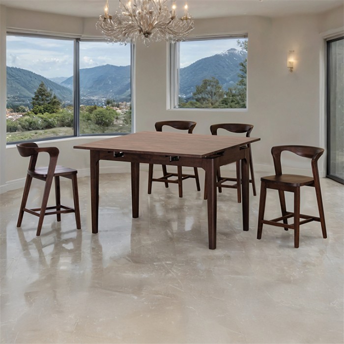Elegant, inviting, and expertly crafted — the Mersin 5 Pc Counter Height Table Set embodies the best of mid-century modern design. Made entirely from full solid rubberwood, it showcases exceptional stability and natural beauty, highlighted by the warm tones of its rich walnut finish.