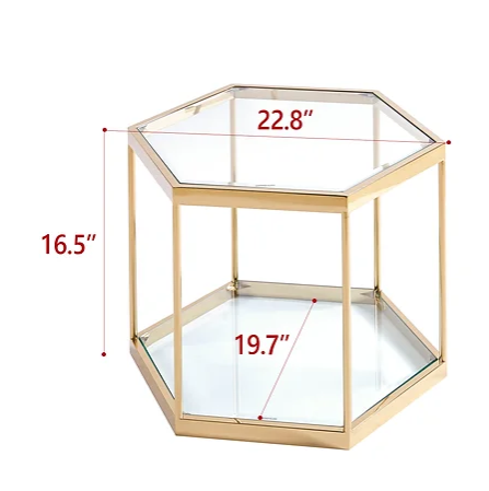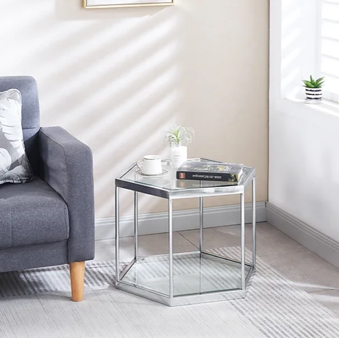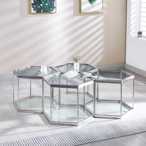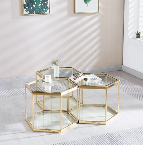 Transform your living room with our coffee tables for sectional couches featuring a sleek hexagon design that perfectly complements any table for sectional couch setup. Crafted with a tempered glass top and a sturdy stainless steel frame, this coffee table blends modern elegance with lasting durability. Available in luxurious gold or silver finishes, it adds a touch of sophistication to your living space while maintaining versatility. The geometric hexagon shape provides a unique focal point and a functional surface for decor, beverages, or essentials. Elevate your sectional couch arrangement with this artisan-crafted coffee table, where style meets practicality in perfect harmony.
