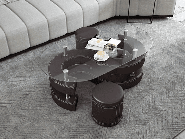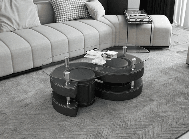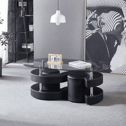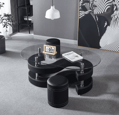 Transform your living space with this stunning set of Oval coffee tables, thoughtfully designed to combine functionality with artistic flair. The oval-shaped tables feature durable 12mm tempered glass tops, supported by a sleek combination of MDF and metal, ensuring long-lasting quality. Complemented by two stylish round stools upholstered in premium PU, this versatile set offers both comfort and sophistication. Available in a variety of colors, including black, white, brown, and red, these artisan tables seamlessly blend into any décor while adding a touch of contemporary charm.