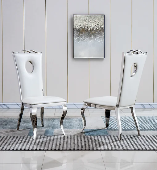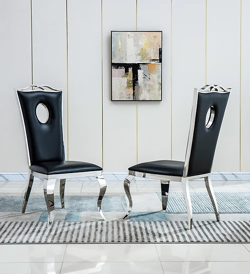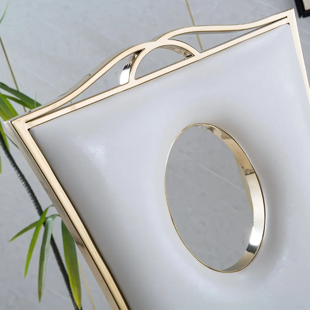 The DCK98 chair’s striking black and white leatherette upholstery delivers a clean, high-contrast look perfect for upscale interiors. Paired with a highly polished 201 stainless steel frame, this structurally-sound design supports both form and function. Its silver and gold mirrored finish adds a luminous quality, reflecting surrounding light while enhancing the visual space of your room.