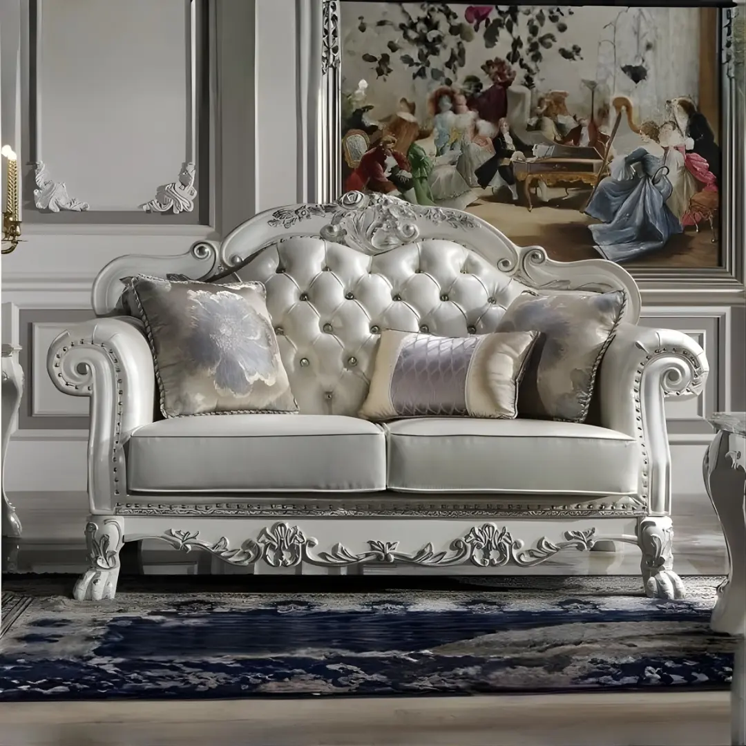 Designed for the discerning homeowner, the Synthetic Leather & Bone White Finish Dresden Loveseat is more than seating—it’s an heirloom-worthy centerpiece. Every curve and flourish is thoughtfully composed to elevate your space with authentic charm and uncompromising detail.