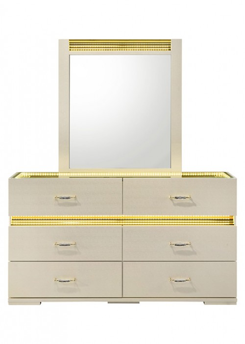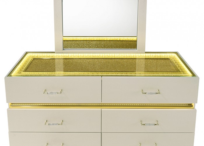 The Lucida Dresser features gold shimmer accents and a crocodile-textured finish that adds visual interest while complementing the plush Lucida Bed. Felt-lined top drawers protect delicate items, while spacious lower drawers provide ample storage for clothing or accessories. Smooth metal side glides ensure effortless operation every day.