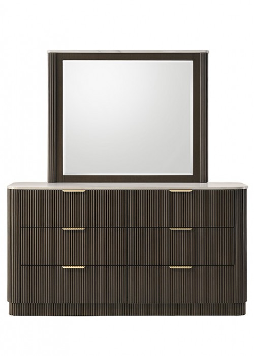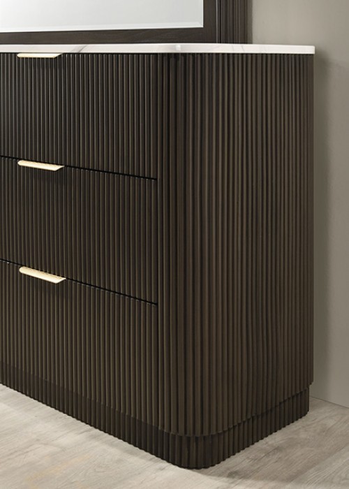 The Lantrisant dresser features clean lines enhanced by a reeded plinth base, adding subtle texture and architectural interest. The dark walnut finish delivers warmth and depth, while gold finger pull hardware provides a touch of modern luxury. Topping the design is an artificial marble surface that adds contrast and an upscale feel to the overall look.