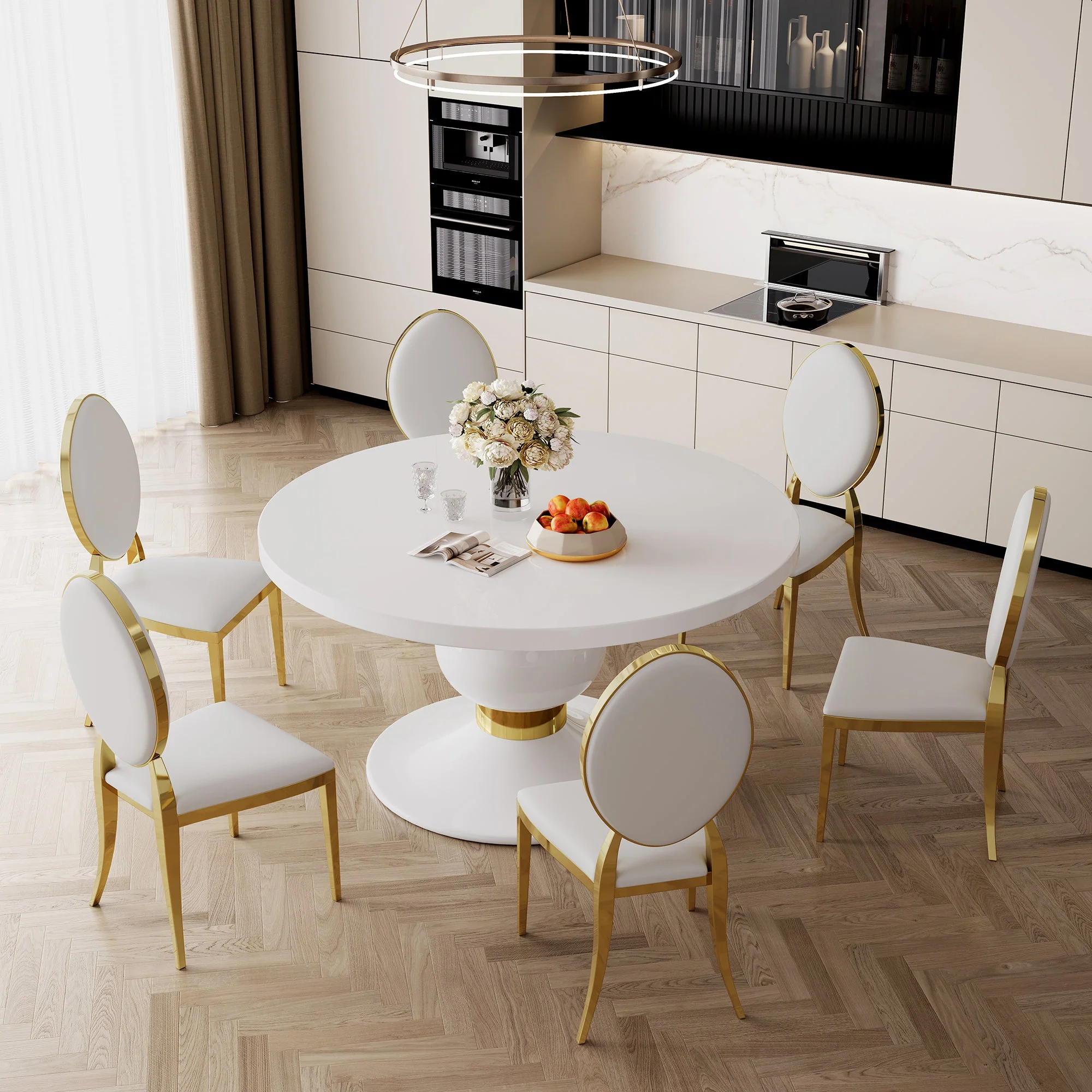 The matte white dining table is a true statement of modern luxury, designed to enhance any dining space with its refined elegance. This artisan dining room table features a 50mm mirror-face MDF panel, offering a sleek and polished look that reflects sophistication. The combination of mirror MDF material and a sturdy 201 stainless steel base creates a striking balance between durability and contemporary design. Finished in a stunning matte white and gold, this matte white dining table exudes a timeless charm, making it the perfect centerpiece for stylish gatherings and unforgettable dining experiences.