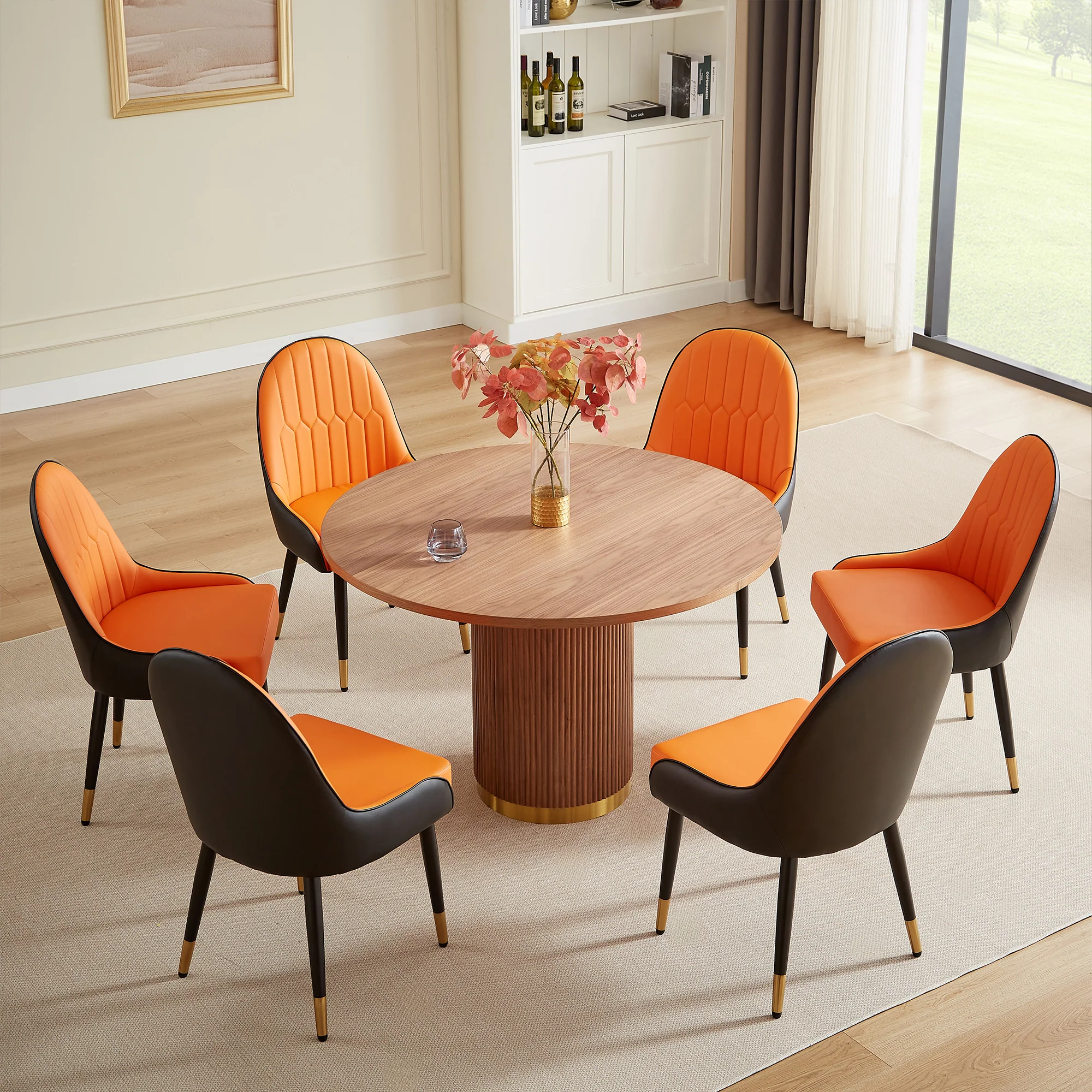A wood pattern table seamlessly blends natural aesthetics with modern craftsmanship, making it a statement piece in any dining space. This round dining table features a sturdy 25mm black MDF panel, beautifully designed to mimic the richness of wood grain while ensuring durability. The bold black ripple legs add a touch of contemporary elegance, creating a striking contrast with the refined 201 stainless steel base, available in white, brown, and black finishes. Whether paired with a matte white dining table for a minimalist look or complemented by a gold finishing table for a touch of luxury, this piece brings versatility and sophistication to every gathering.