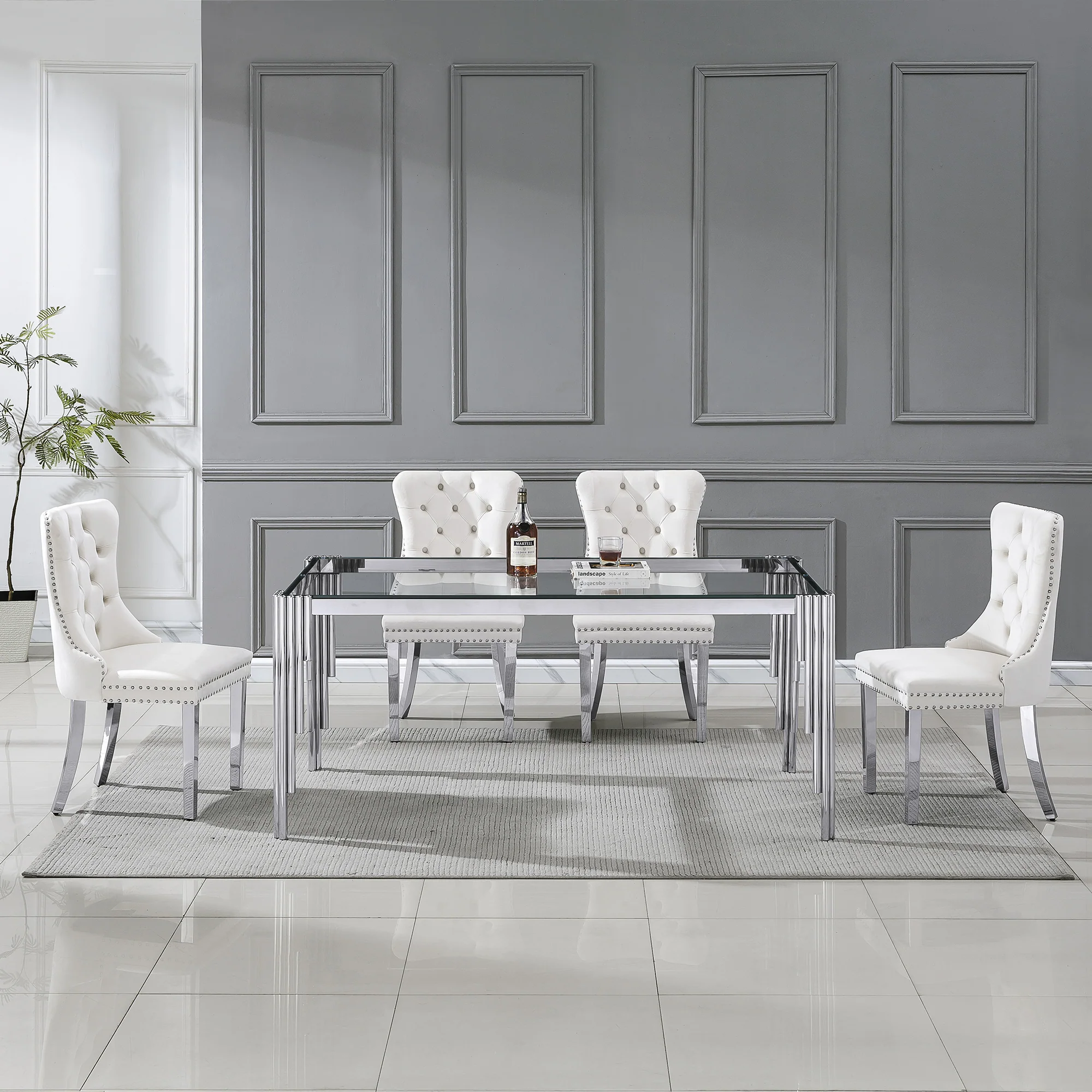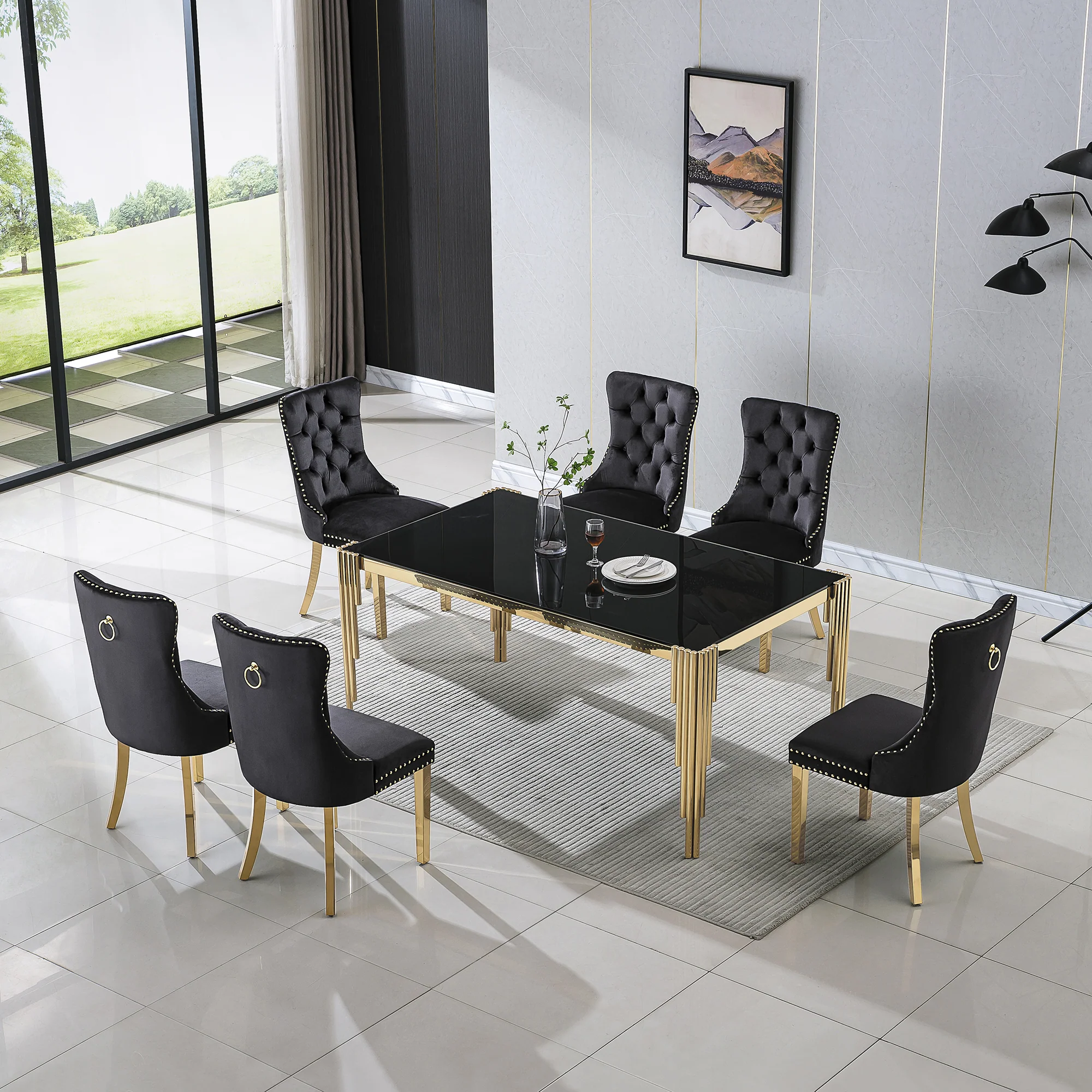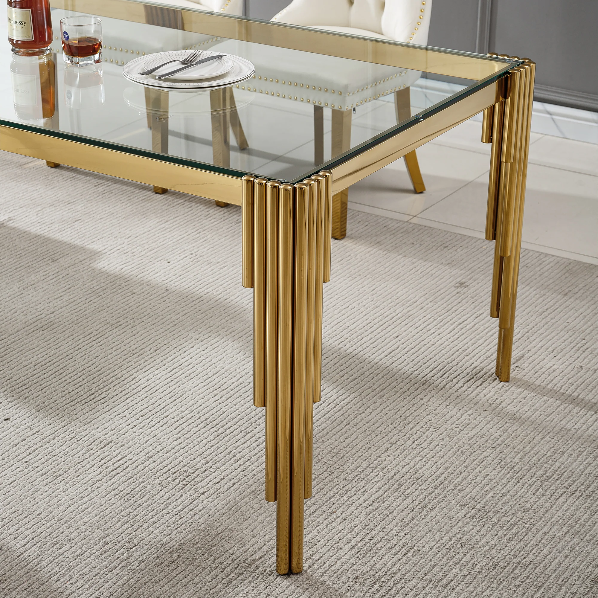 Enhance your dining experience with our tempered glass for dining table top, designed for both elegance and durability. Crafted from 10mm clear tempered glass, this sleek surface offers exceptional strength and a pristine, modern aesthetic. The table is supported by a 201 stainless steel dining table base with a stunning gold mirrored finish, blending luxury with artisan craftsmanship. Perfect for contemporary spaces, this exquisite artisan dining table is a statement of sophistication, ensuring style and resilience for years to come.