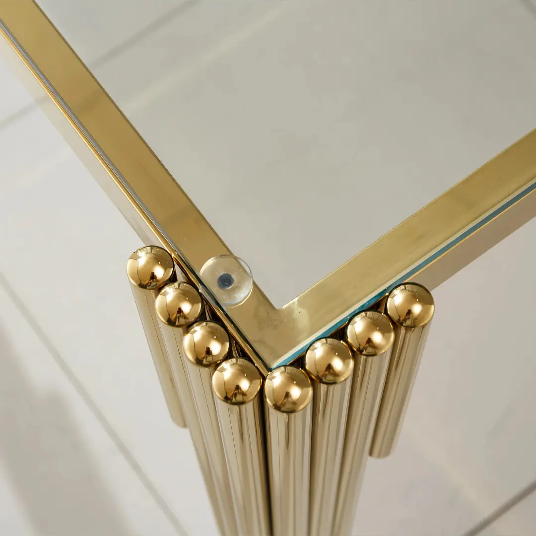 What sets this table apart is its architecturally sculpted base—made from 201 stainless steel with a luxurious gold and silver mirrored finish. This bold, reflective frame adds a luminous contrast beneath the sleek glass surface, bouncing natural or artificial light to illuminate your room with style and intention.