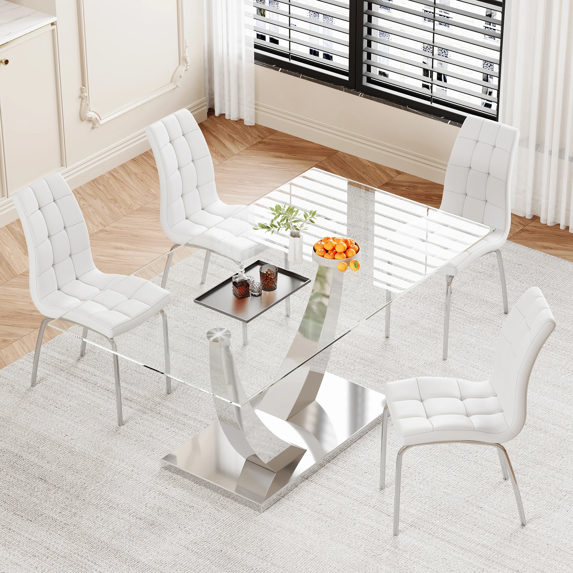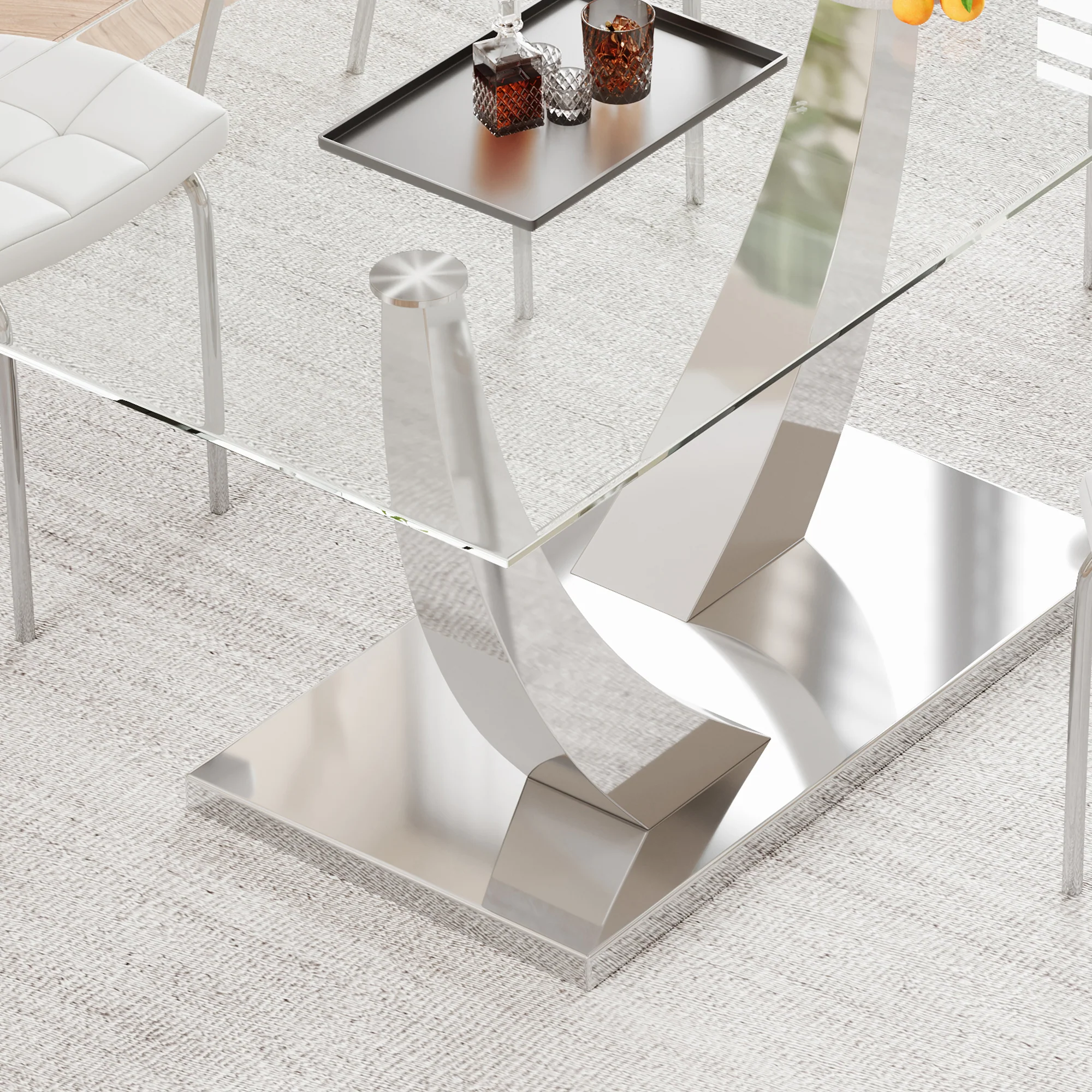 Make a bold statement in your dining space with our exquisite glass top dining room table, a perfect fusion of elegance and durability. Featuring a 10mm tempered glass surface, this table exudes modern sophistication while ensuring lasting strength for everyday use. The 201 stainless steel dining table base, available in a dazzling gold or silver mirrored finish, adds a touch of luxury and refinement. Designed to be both visually striking and highly functional, this tempered glass dining room table transforms any meal into a stylish dining experience. Perfect for contemporary homes, it’s the ultimate centerpiece for those who appreciate fine craftsmanship and timeless design.