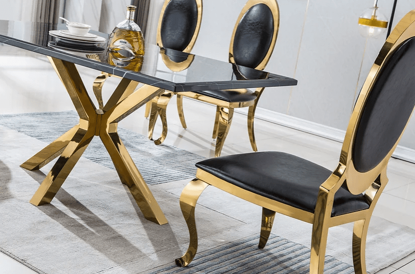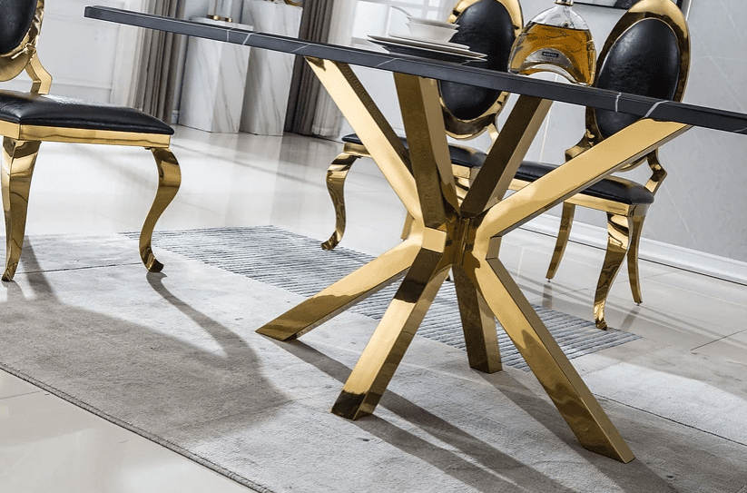 Make a bold statement with this sophisticated dining table featuring dining room table legs metal for unmatched style and durability. The rectangular tabletop, crafted from premium 26mm black marble, radiates luxury and elegance, offering a striking contrast to the gleaming gold mirrored finish of its stainless steel legs. These meticulously designed legs provide exceptional stability while adding a touch of opulence to your dining space. Perfect for hosting memorable dinners or elevating everyday meals, this artisan-crafted masterpiece is a seamless blend of modern design and timeless beauty.