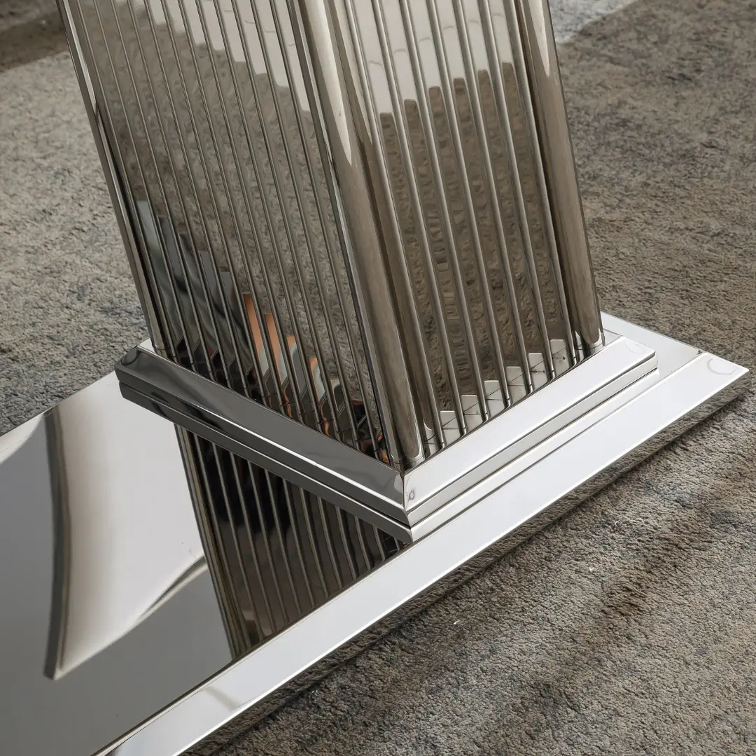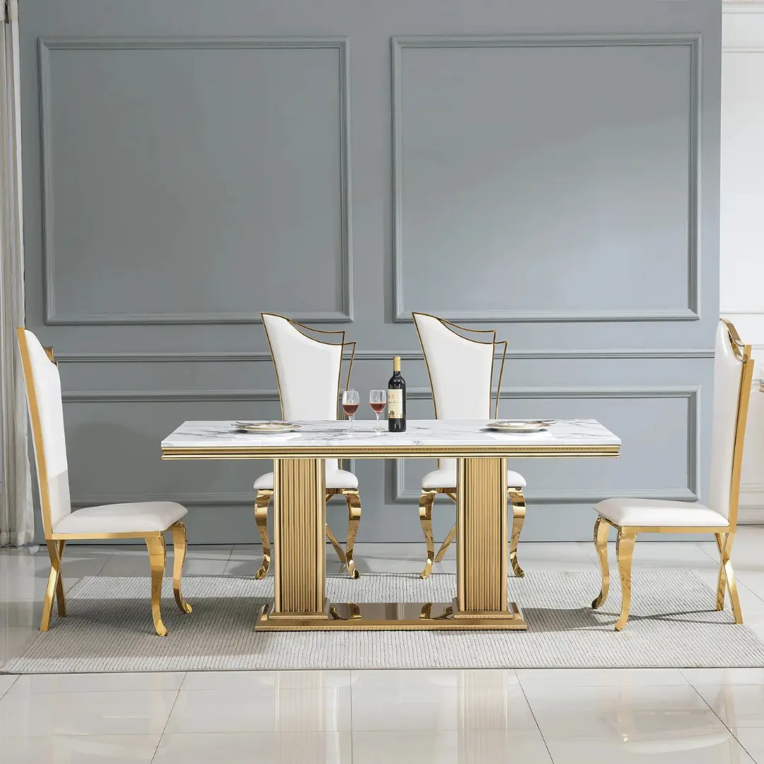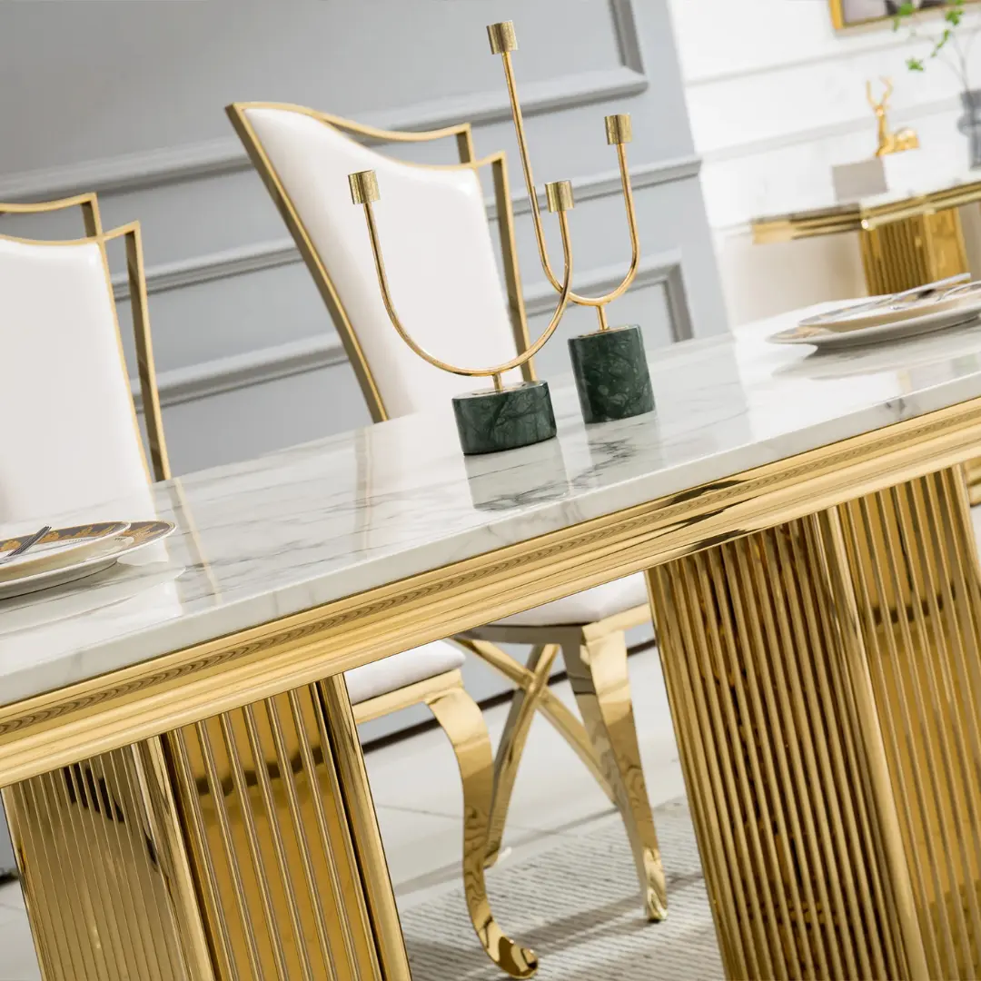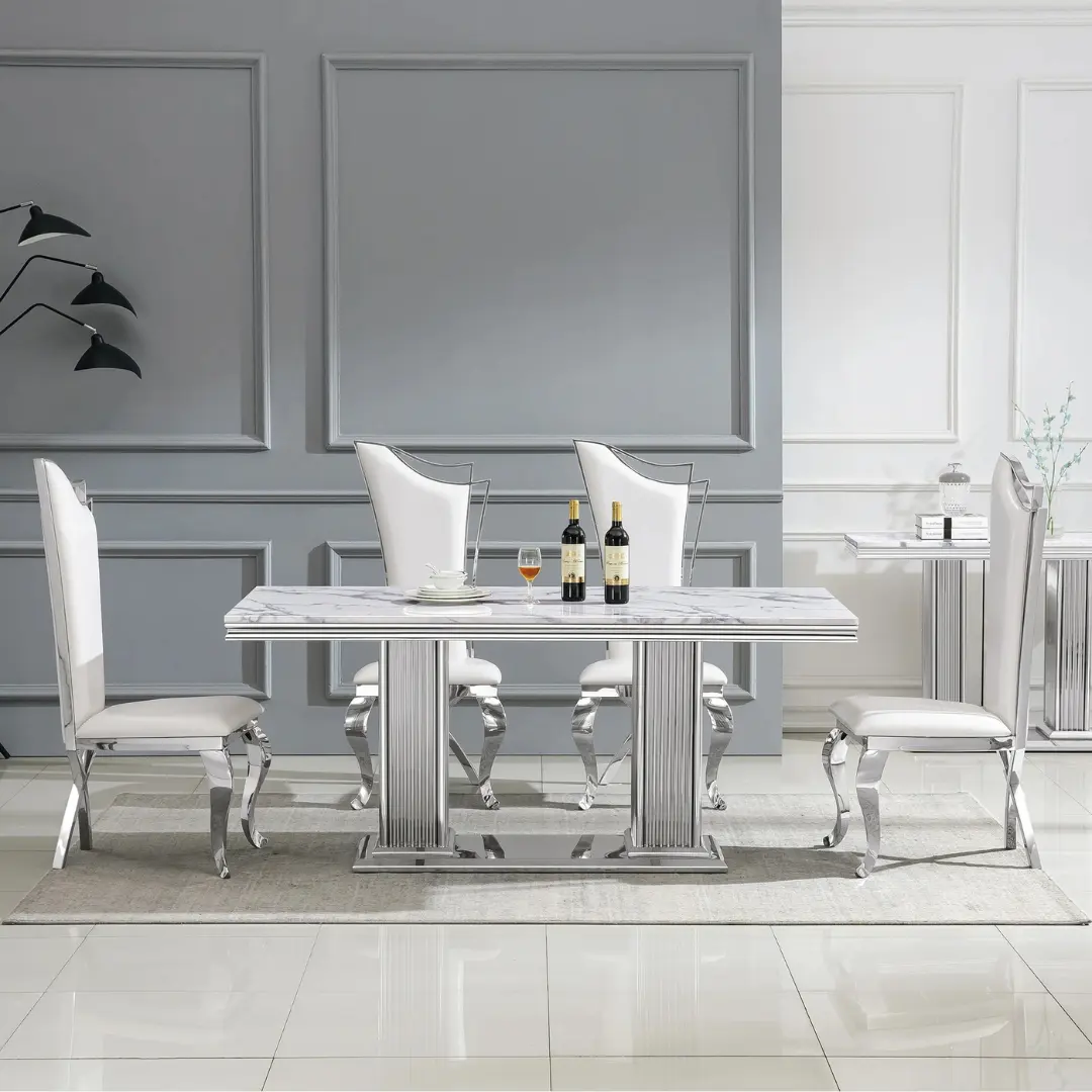 The DT301 Dining Table isn’t just about aesthetics – it’s engineered for strength and stability. The stainless steel pedestal base not only supports the substantial marble top but also adds a luxurious reflective nuance with your choice of radiant gold or sleek silver finish. This architectural design ensures visual impact while maintaining an open, airy feel in the room.