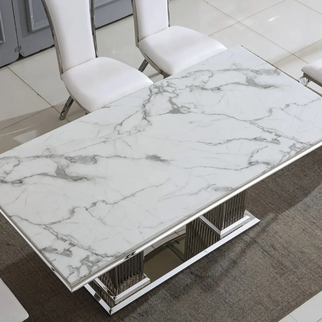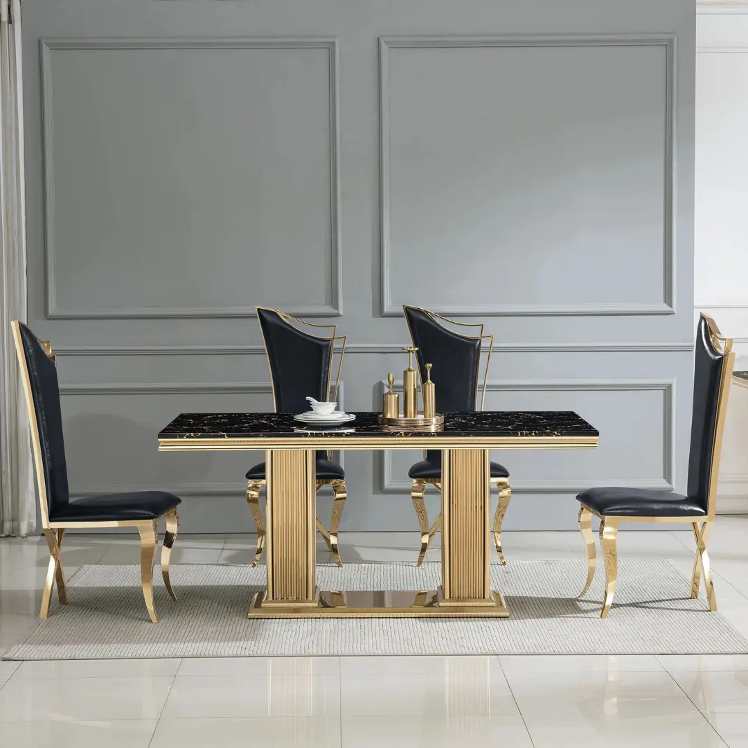 Constructed with a striking 18mm white and black marble top, this rectangular dining table exudes timeless elegance. Its sleek surface showcases natural veining patterns, giving each piece its own unique character while ensuring durability and long-term brilliance. The DT301 is more than a table — it’s a centerpiece that defines the atmosphere of any gathering.