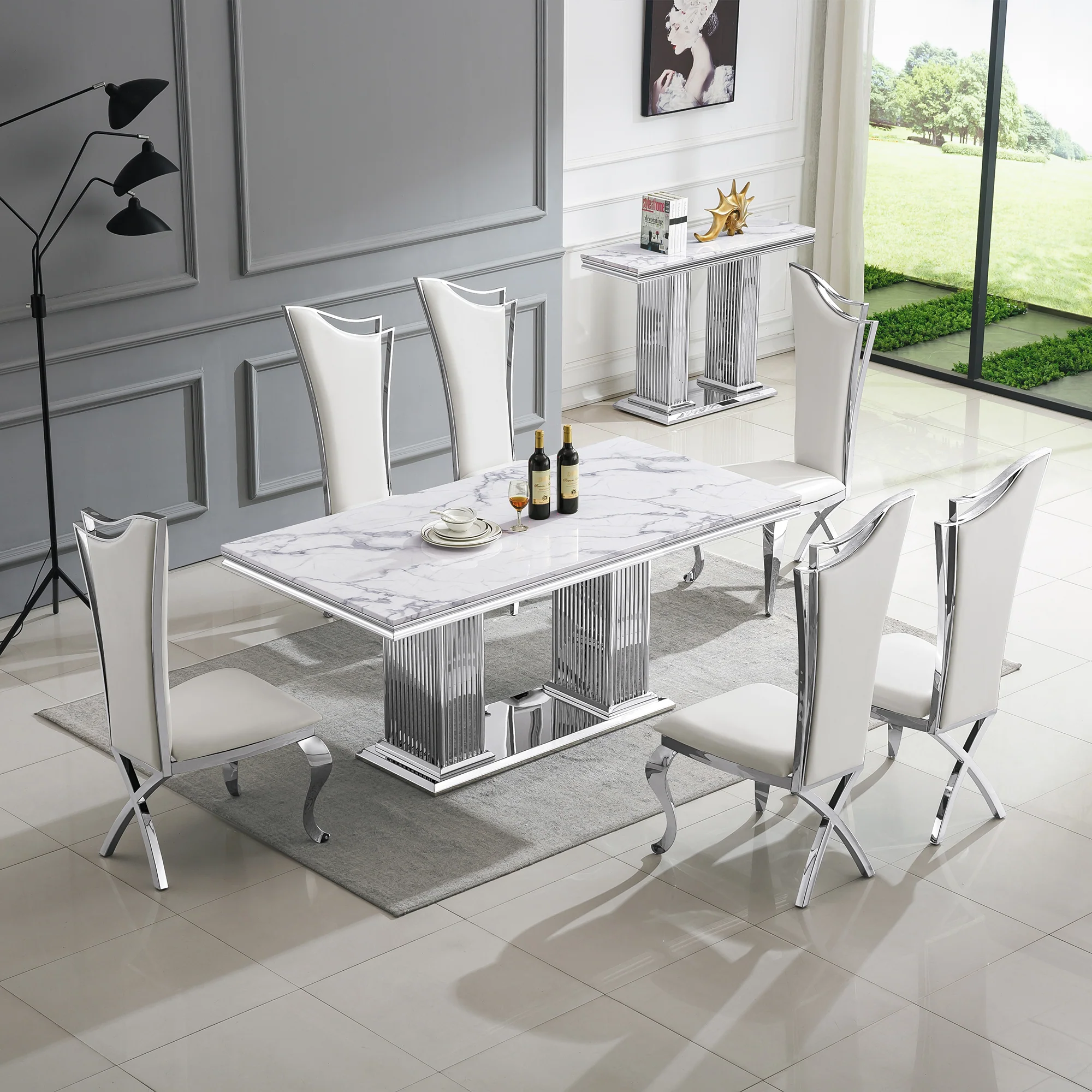 A white and black marble dining table is the perfect blend of elegance and modern sophistication, transforming any dining space into a luxurious experience. Crafted with a sleek 18mm white and black marble top, this rectangular dining table exudes timeless beauty and durability. The sturdy 201 stainless steel base is finished in a radiant gold or silver mirrored touch, adding a refined aesthetic that complements contemporary and classic interiors alike. Whether hosting elegant dinner parties or enjoying everyday meals, this stunning table creates a statement of style and grandeur in your home.