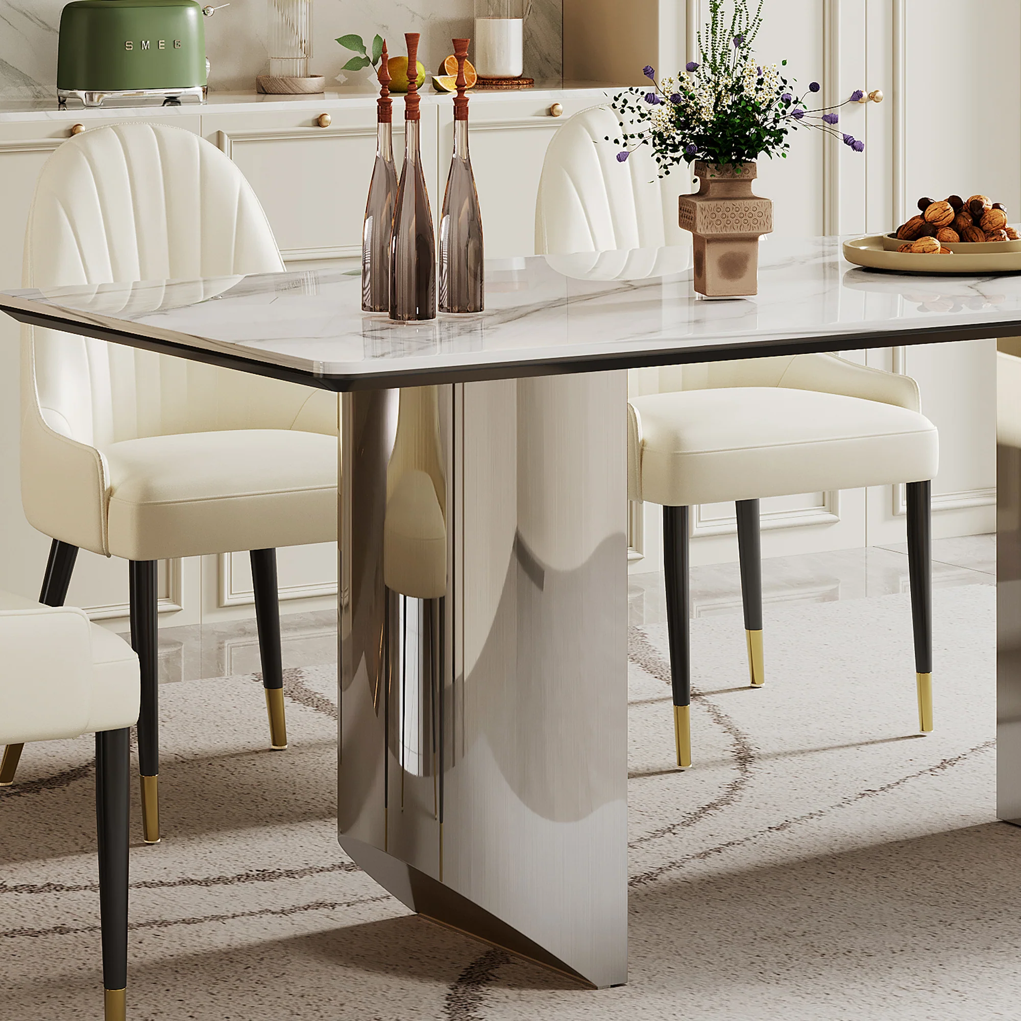 a perfect blend of contemporary design and artisan craftsmanship. Featuring a sleek rectangular surface with 6mm black tempered glass layered over a 6mm white rock plate, this table creates a striking visual contrast that’s both elegant and modern. Supported by a sturdy 15mm MDF panel and a golden brushed 201 stainless steel base, it exudes luxury and durability. This dining table is not just a functional centerpiece—it’s a work of art that transforms your dining space into a sophisticated retreat.