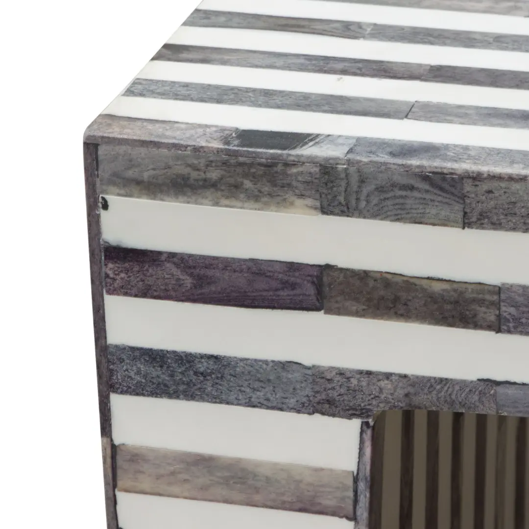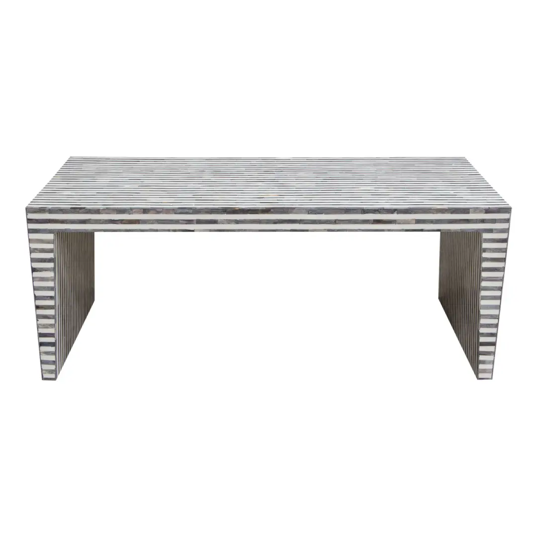 Bone inlay furniture is known for its meticulous detail and heritage-inspired artistry. The mosaic tabletop of this elegant coffee table showcases a carefully arranged linear pattern that adds depth, texture, and luxury to the piece.
