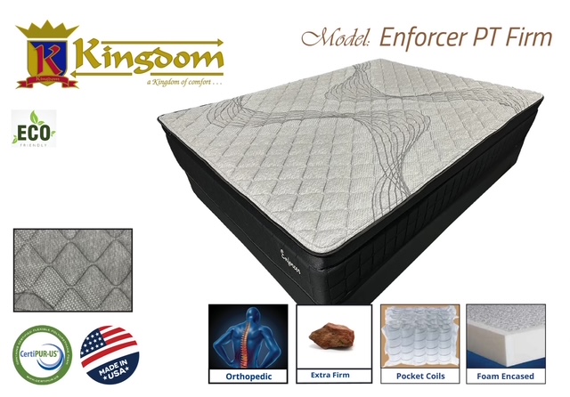 Pillow‑top cover adds softness and an elevated feel, while the underlying structure remains firm. According to Kingdom’s site, the Enforcer PT Firm is part of their “Enforcer” collection and is described as “14″ Firm Pillow‑Top” featuring wrapped coils and foam encasement.