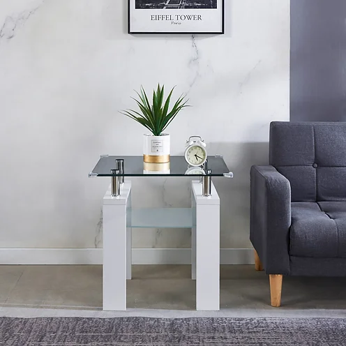 The end table is a perfect balance of modern sophistication and functionality, making it an ideal table for a sectional sofa. Designed with a sleek 8mm tempered glass top and a 6mm inner glass layer, it offers both durability and a refined aesthetic. The sturdy stainless steel frame and high-quality MDF base, finished in elegant black or white lacquer, add a contemporary touch that seamlessly blends with any décor. Whether placed beside a sectional or used as a stylish accent piece, this table enhances your living space with its sleek design and premium materials. Elevate your home with this statement piece that combines artistry with everyday practicality.