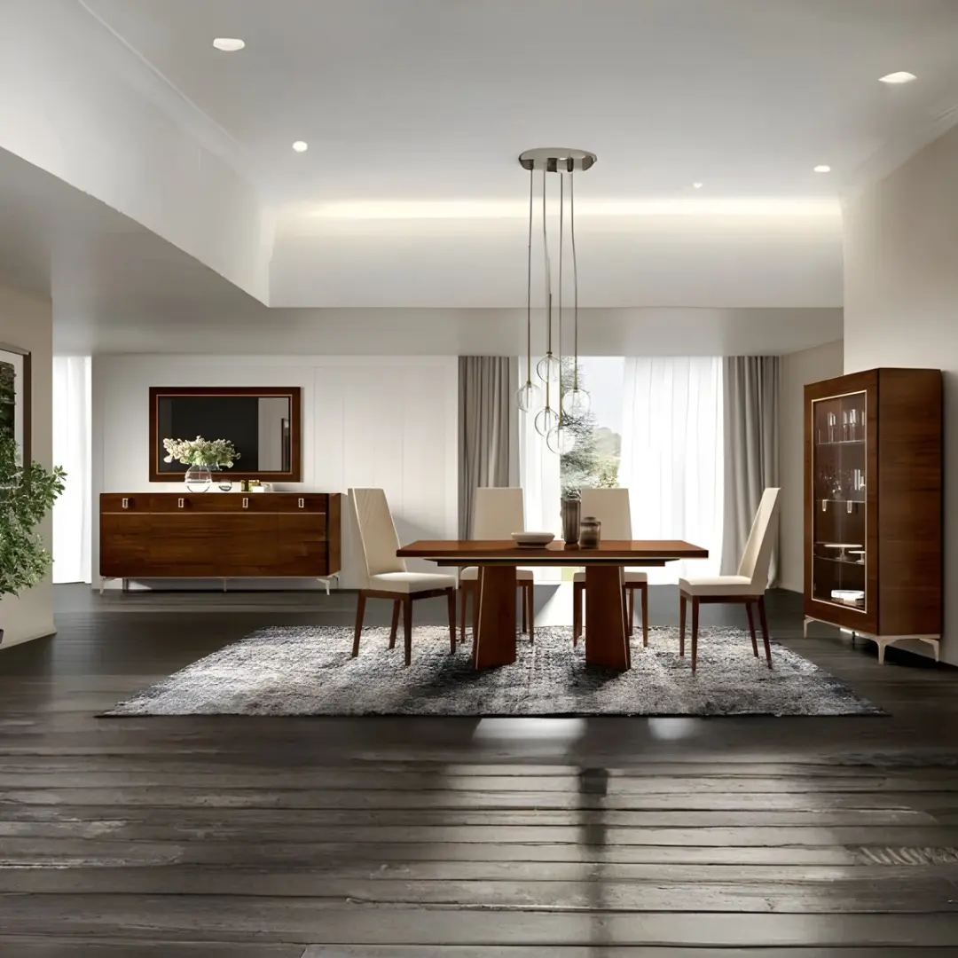Welcome to the exquisite “Eva” dining room, a space that exudes timeless elegance and a warm, inviting ambiance with its stunning tobacco walnut finishes. Step into this refined setting, where classic design and natural beauty harmoniously come together to create an unforgettable dining experience.