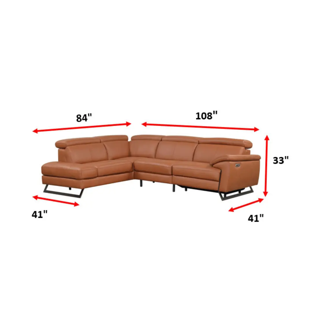 The Gea sectional is as functional as it is stylish—equipped with adjustable headrests and a power reclining feature for customized relaxation. Its sleek dark metal legs and structured silhouette offer a refined edge, making it a bold yet welcoming centerpiece.