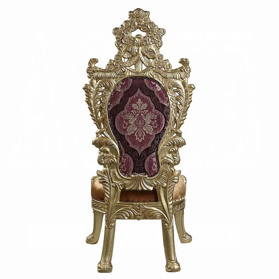 These chairs feature patterned upholstery paired with a gold-finished frame, giving your dining area a rich, luxurious appeal. Decorative moldings and carvings accentuate the sophisticated design:
